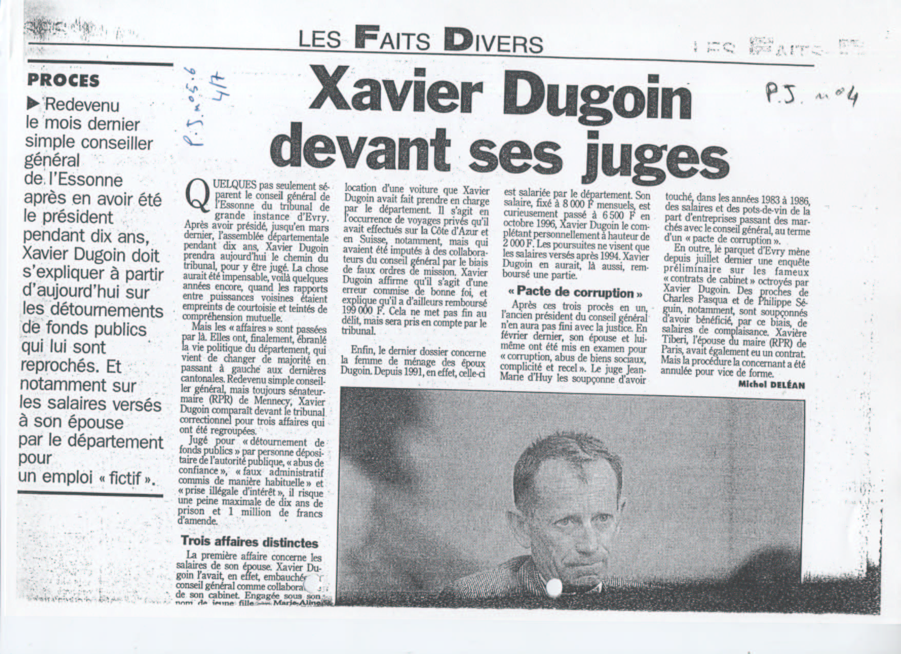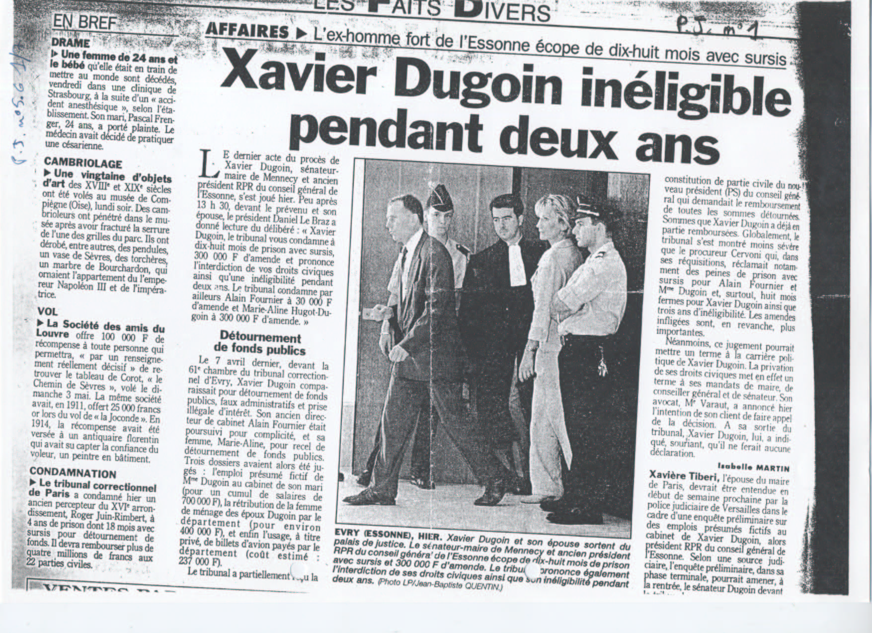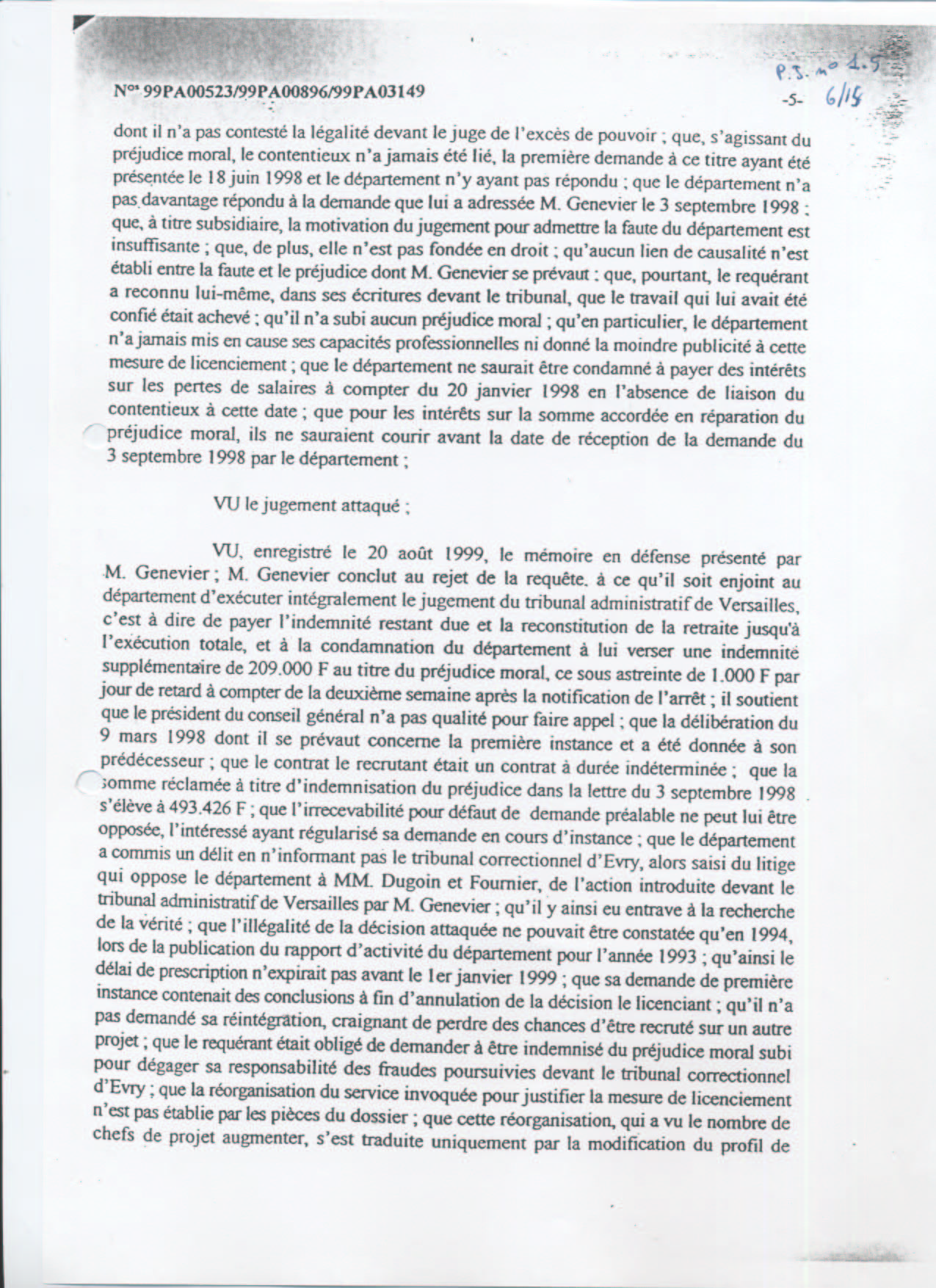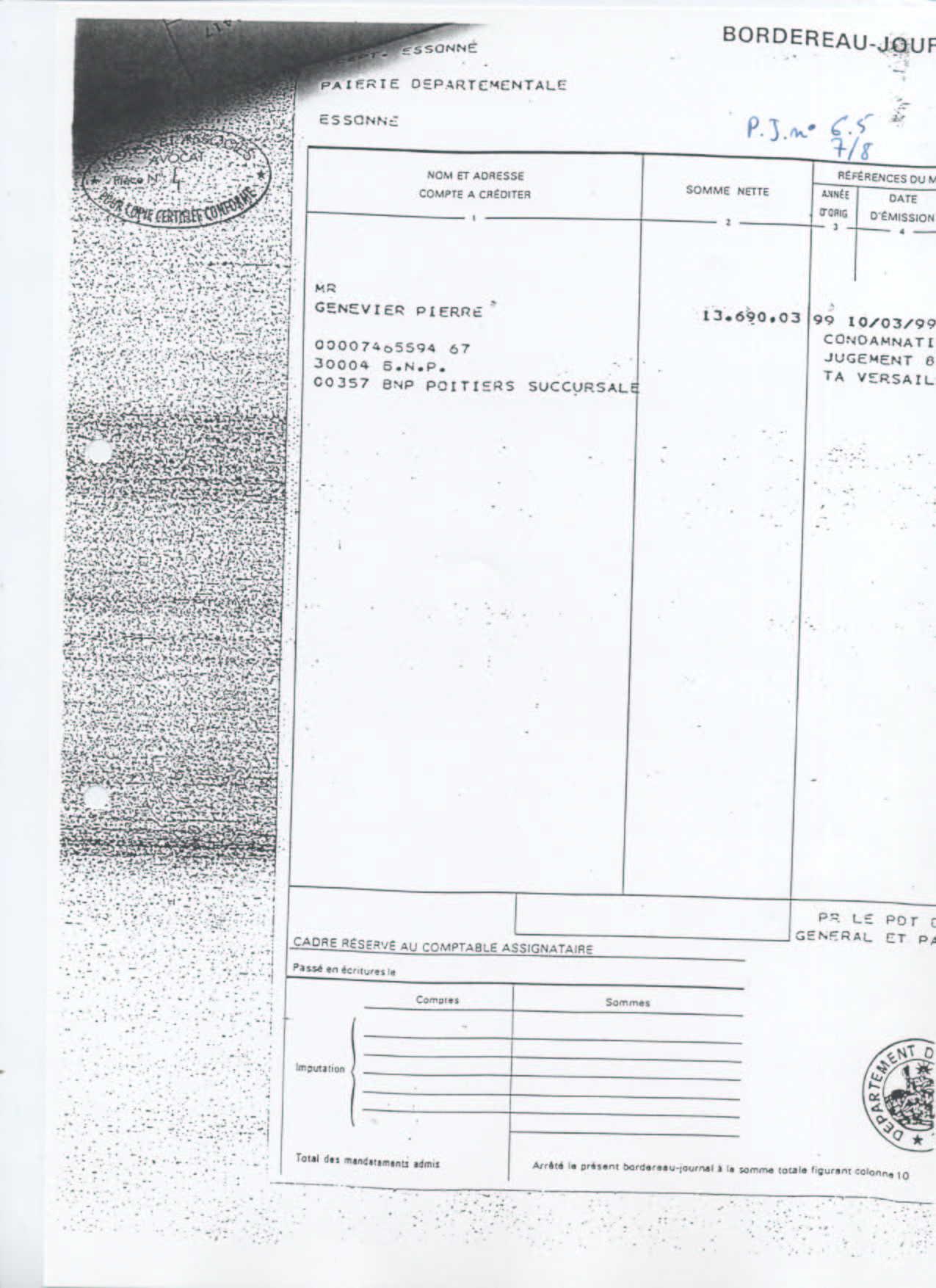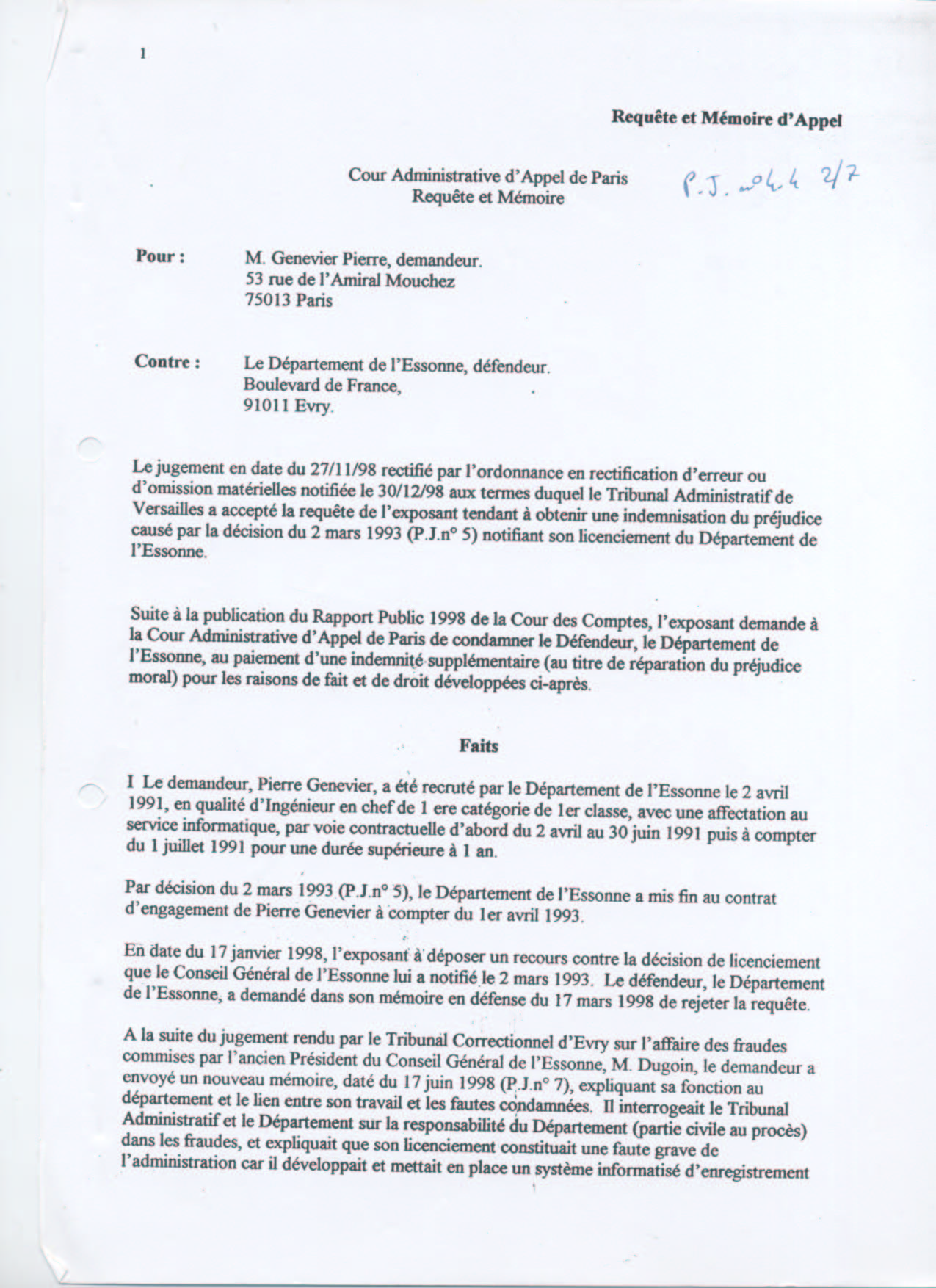 In January 1999, the ‘Court des Comptes’ (COURT OF ACCOUNTS), the agency that controls the work of administration in France listed the Department of Essonne’s various frauds in its annual report and mentioned that the administration lost 100s of millions of francs