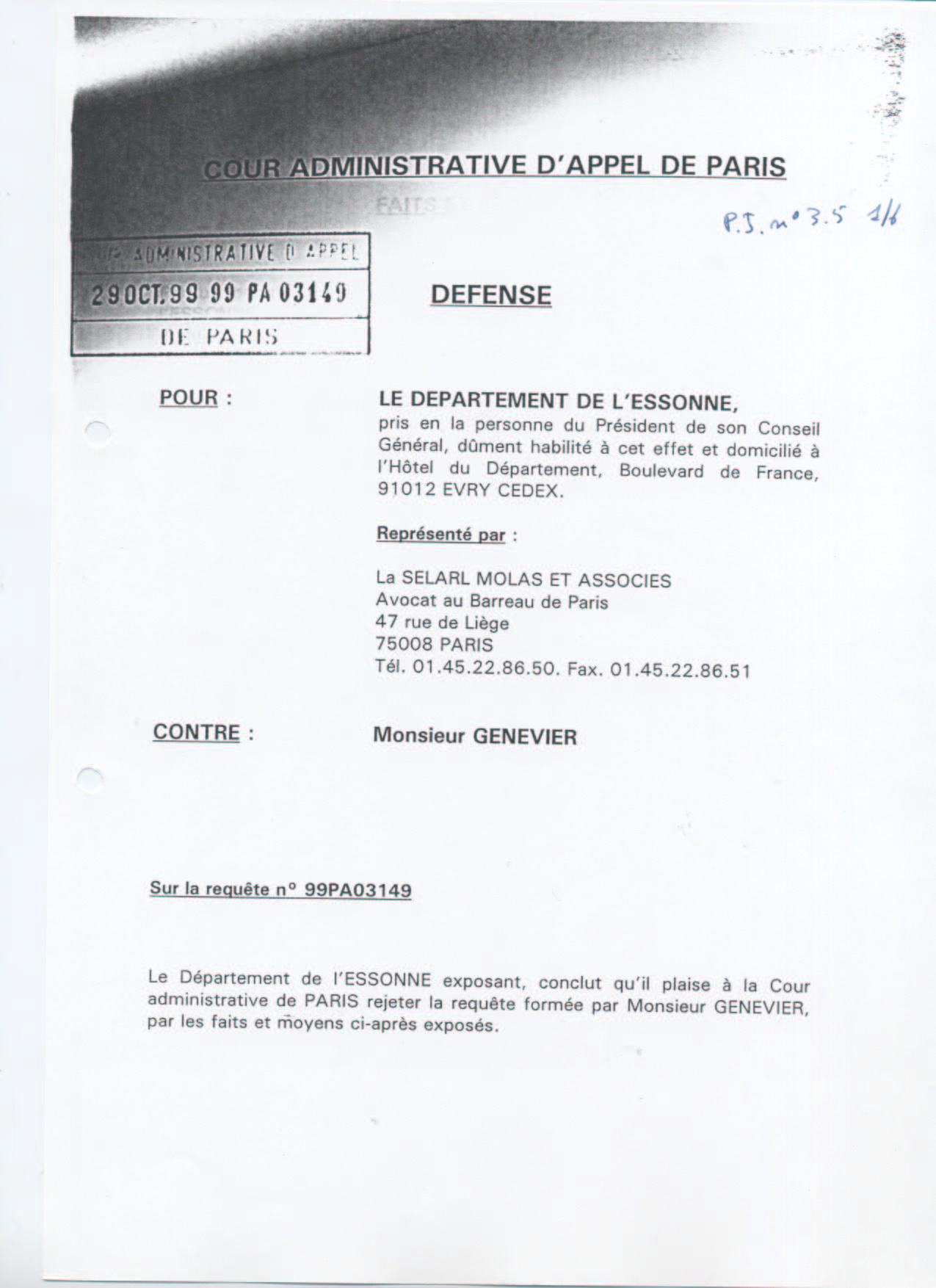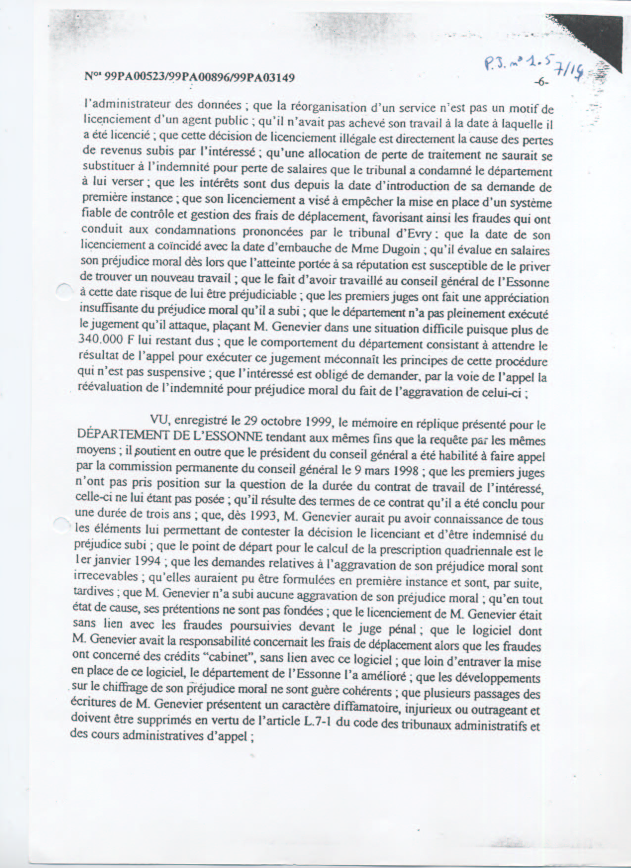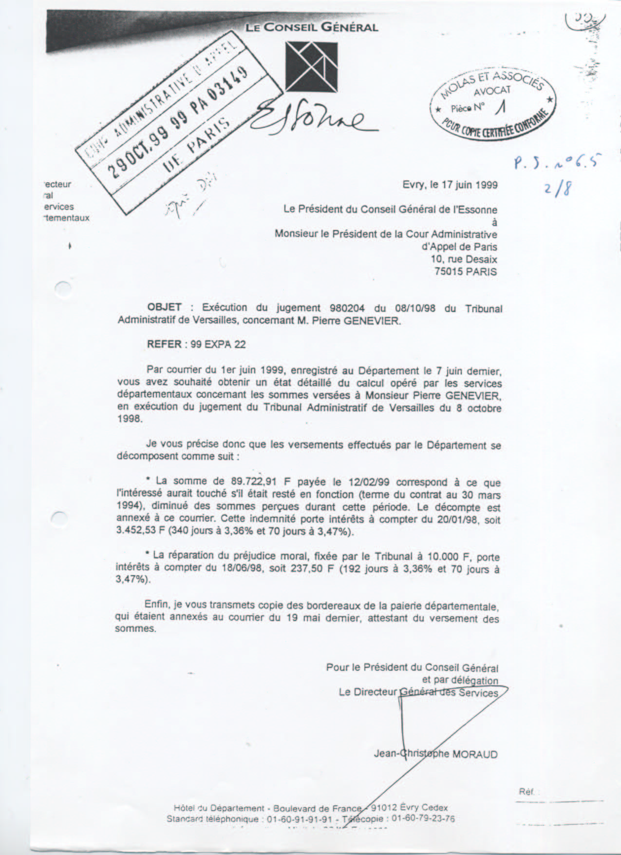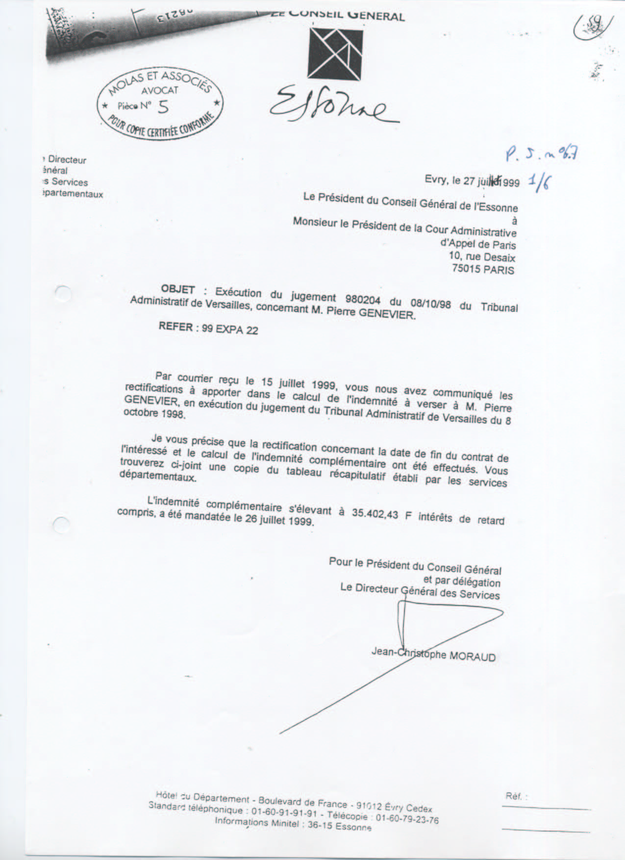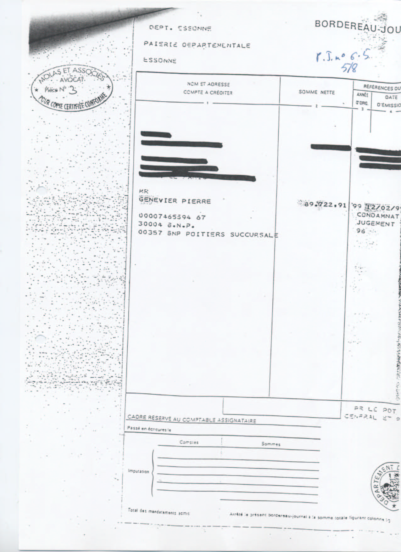 In January 1999, the ‘Court des Comptes’ (COURT OF ACCOUNTS), the agency that controls the work of administration in France listed the Department of Essonne’s various frauds in its annual report and mentioned that the administration lost 100s of millions of francs