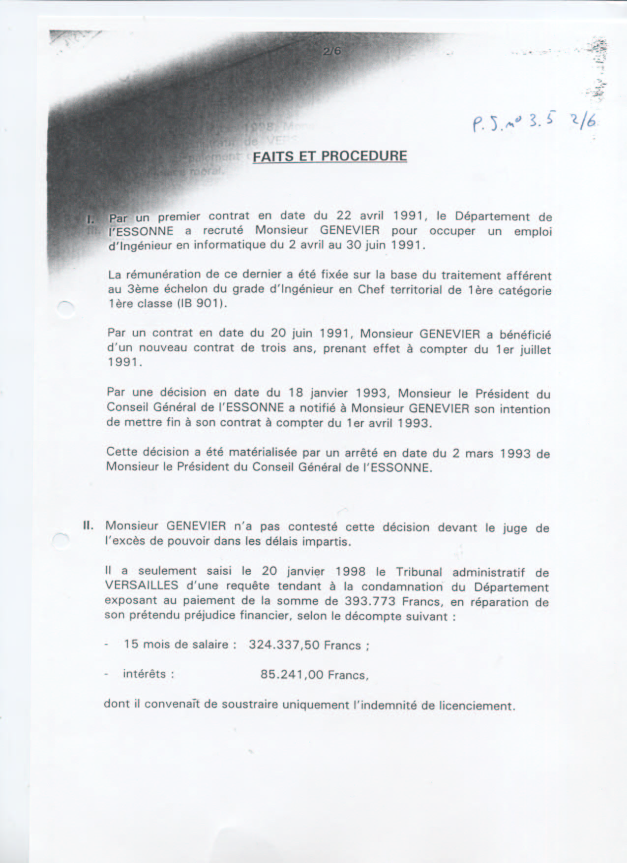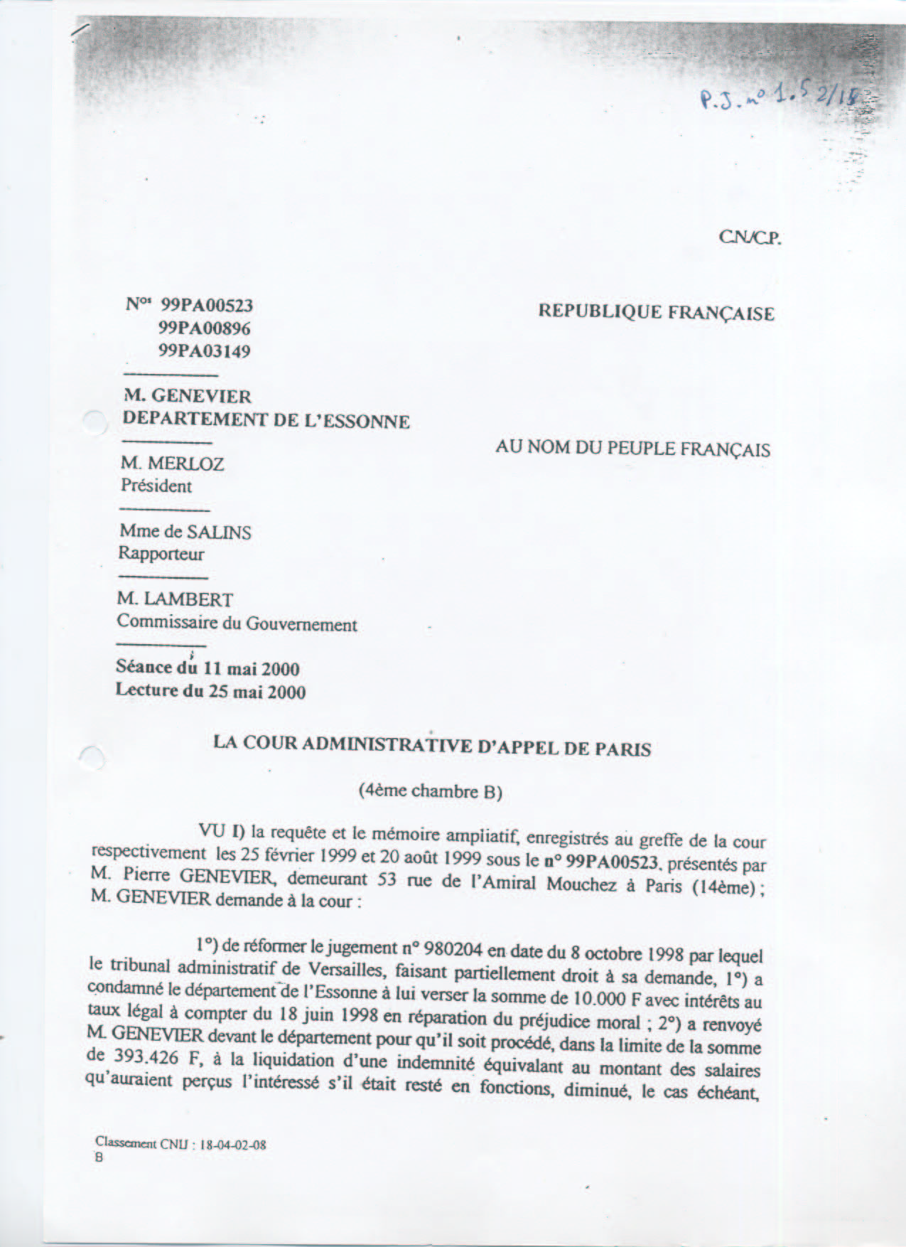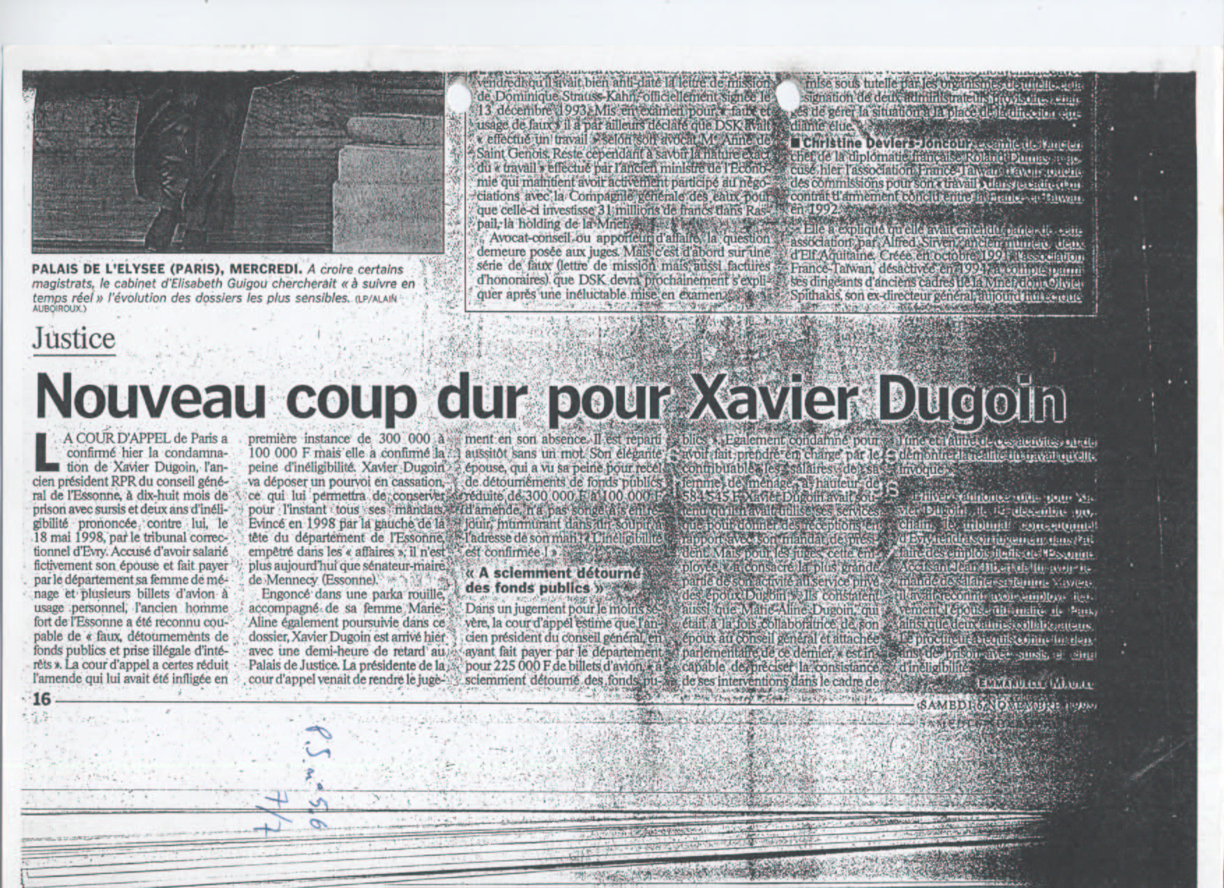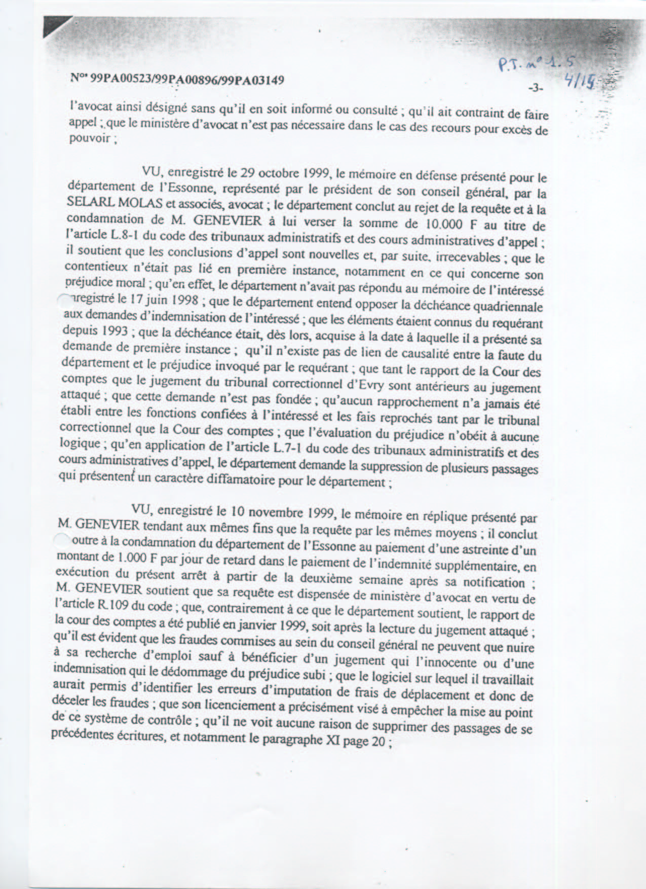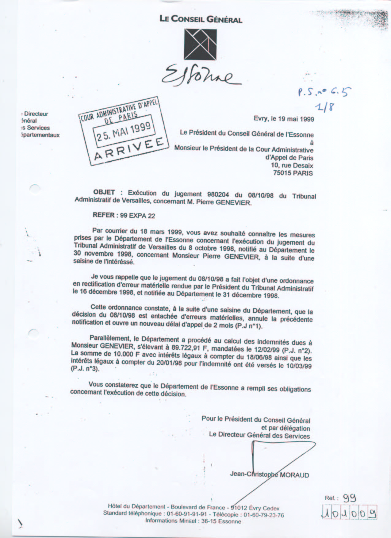 In January 1999, the ‘Court des Comptes’ (COURT OF ACCOUNTS), the agency that controls the work of administration in France listed the Department of Essonne’s various frauds in its annual report and mentioned that the administration lost 100s of millions of francs