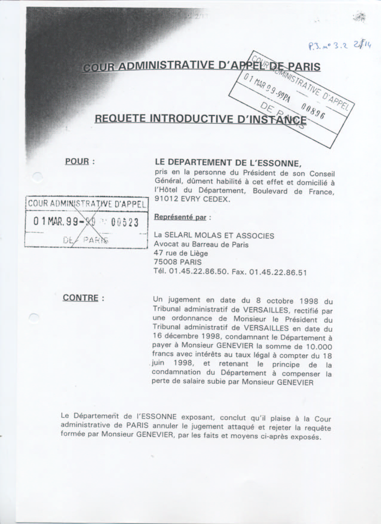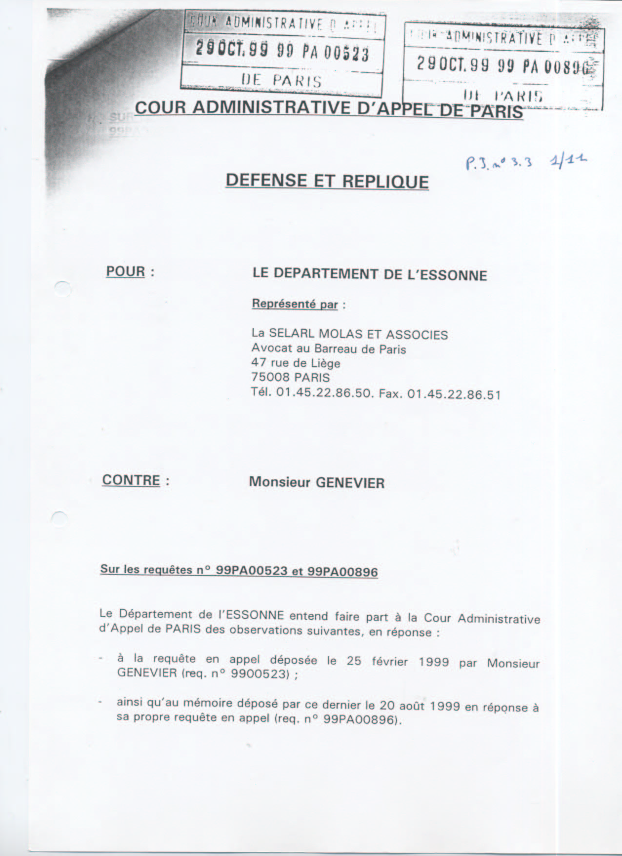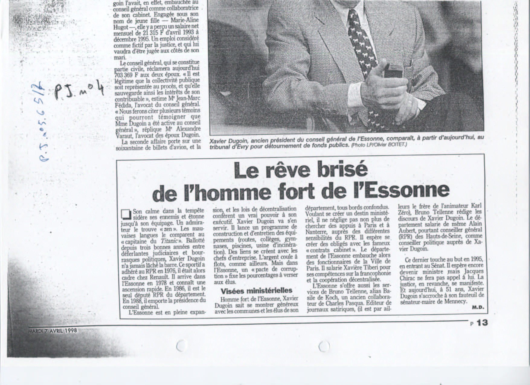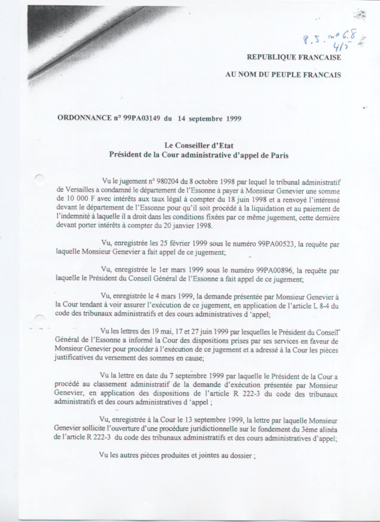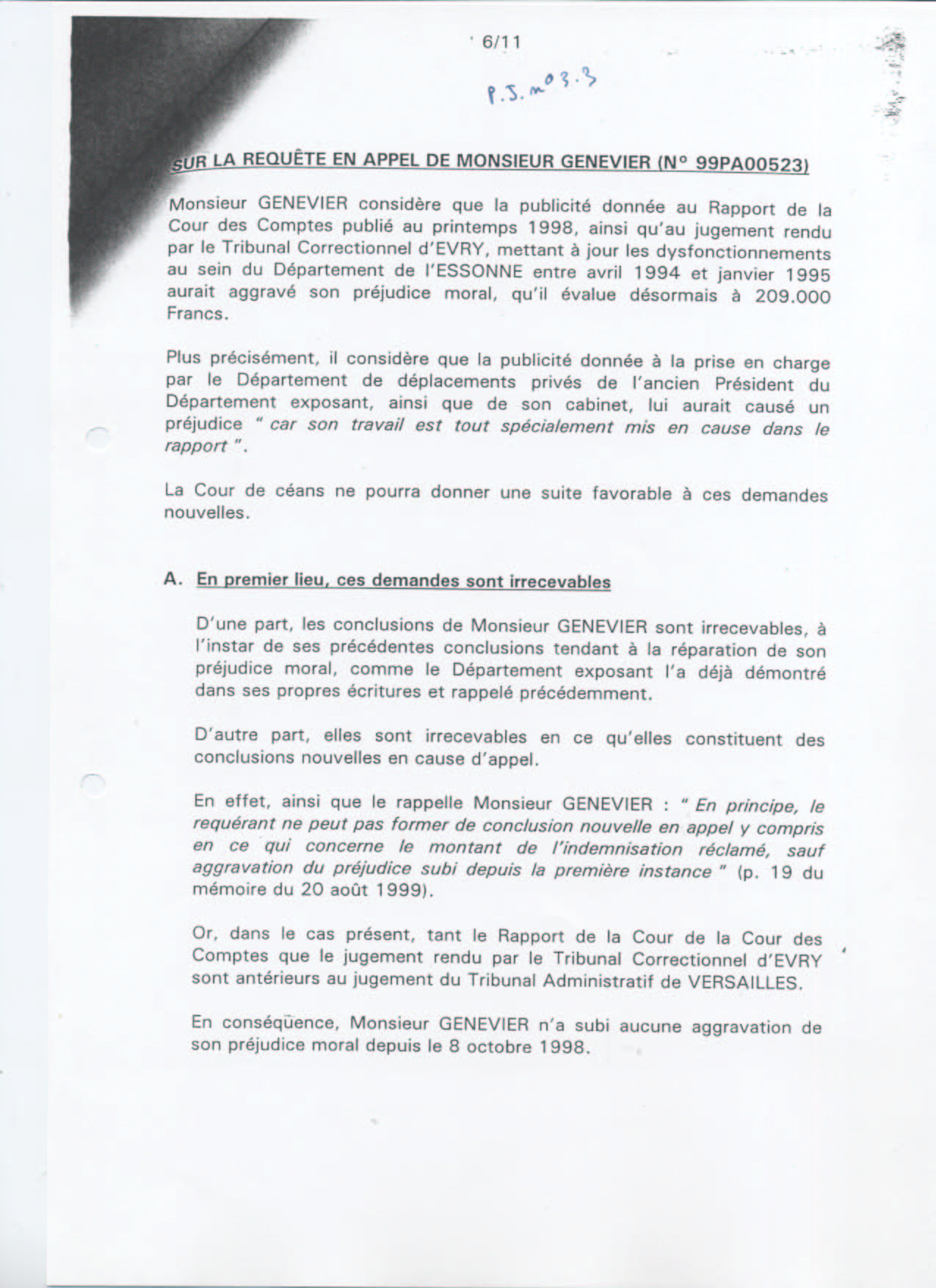 In January 1999, the ‘Court des Comptes’ (COURT OF ACCOUNTS), the agency that controls the work of administration in France listed the Department of Essonne’s various frauds in its annual report and mentioned that the administration lost 100s of millions of francs