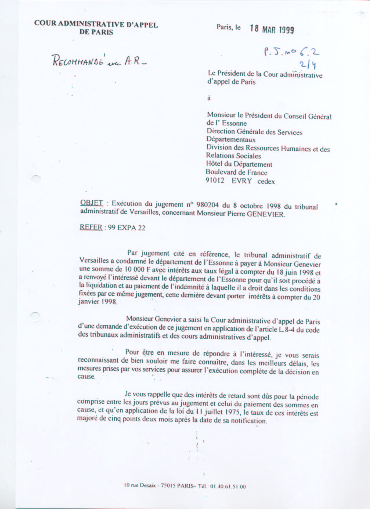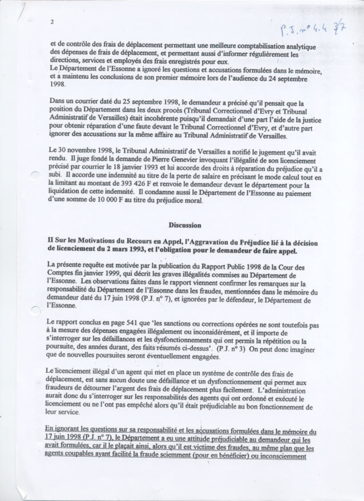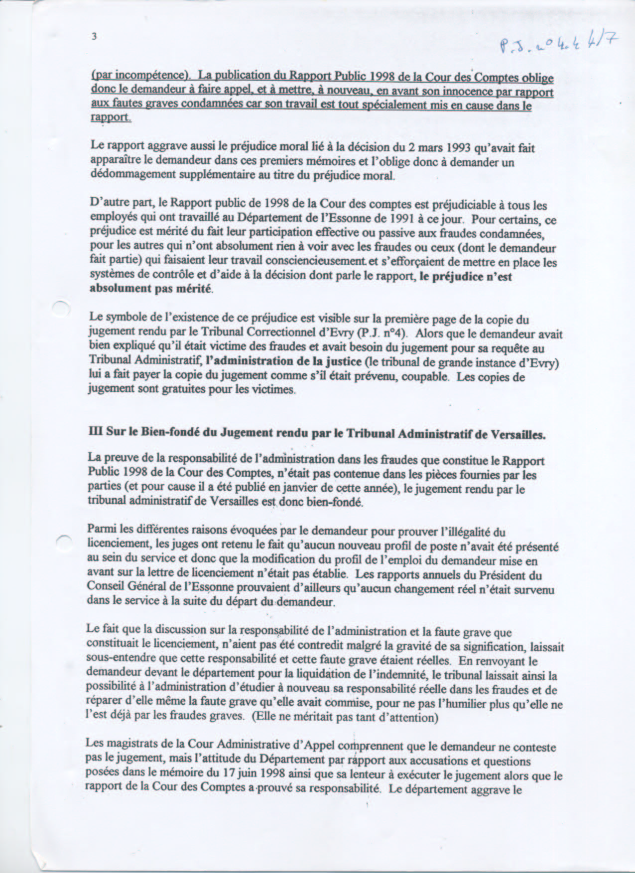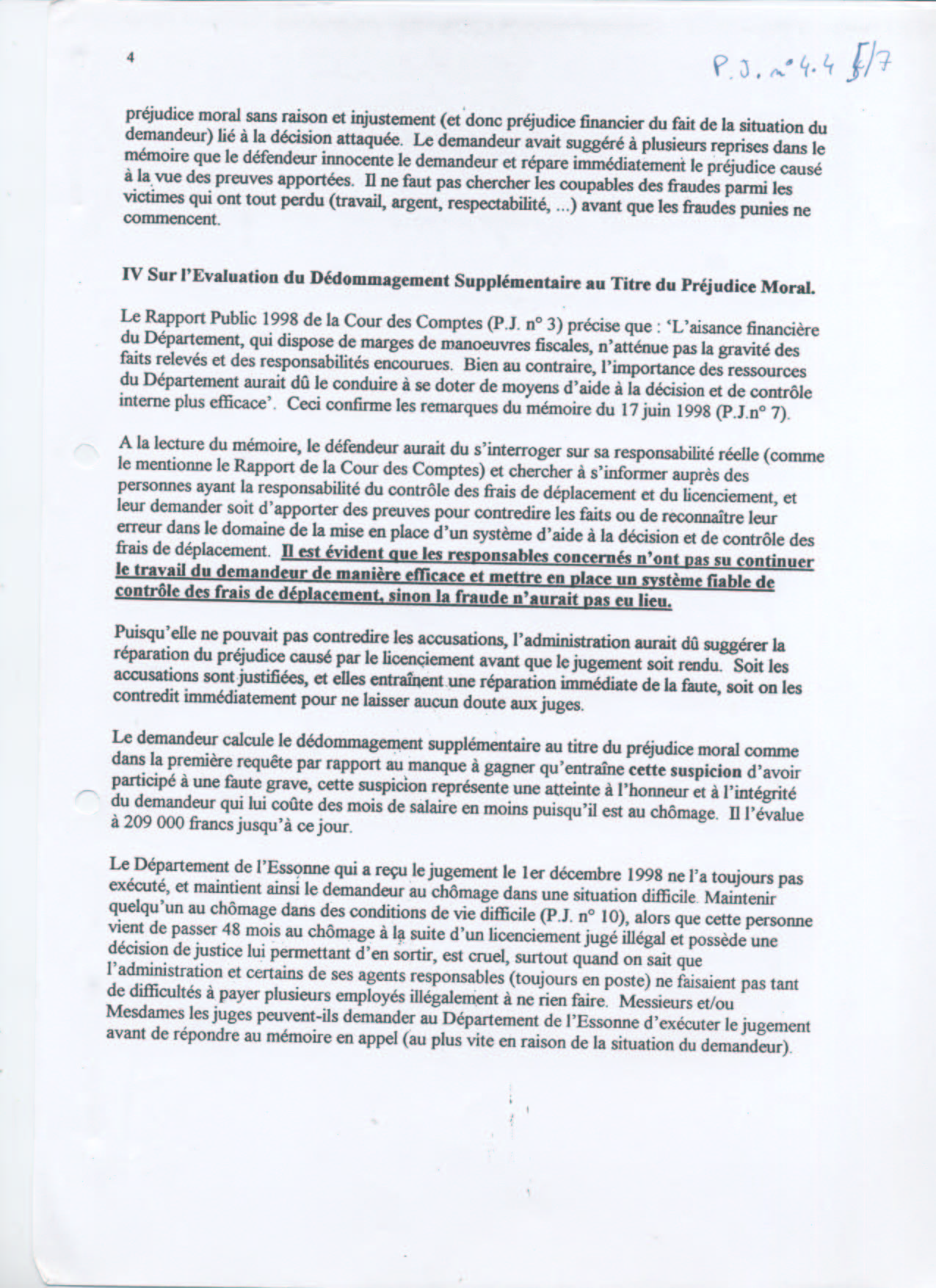 (see http://www.ccomptes.fr/FramePrinc/frame-rapports.htm, choose 'Publications:' 'liste des rapports', 'Rapports publics annuels 1998'). This new official publication on the frauds created me an even greater prejudice because I had absolutely nothing to do with these frauds, on the contrary, I was working to prevent one of them – the fraud on the travel expenses that allowed the administration President to unfairly increase his yearly salary by about FF220 000 ($40 000 about). The refusal to pay the judgment immediately also created me a greater prejudice because I was living in very difficult condition, was still having a lot of difficulties to find a job, and the amount of money I was granted would have helped me to justify that I had no responsibility in the frauds and that my dismissal was not for a professional wrongdoing (I could not hide on my resume that I worked at the Department of Essonne!). So I had to file an appeal to explain this new prejudice to the court and to ask for an additional compensation (about FF200 000, or $40 000), and did so in February 1999 [see