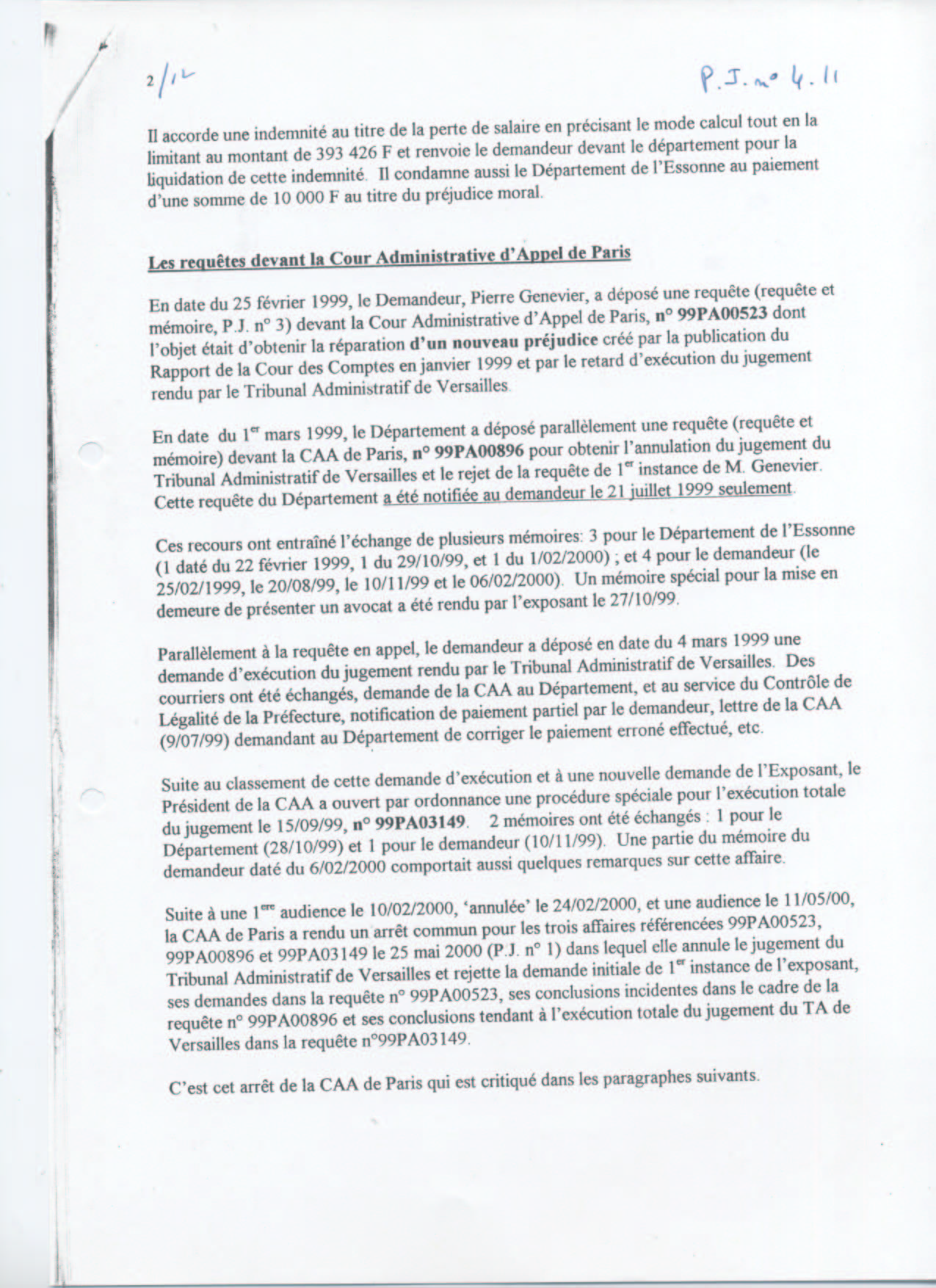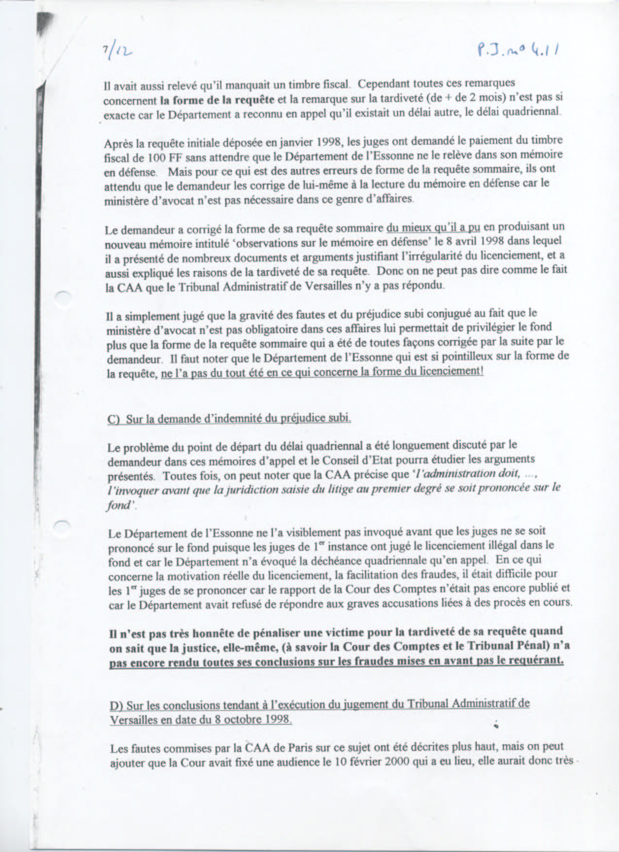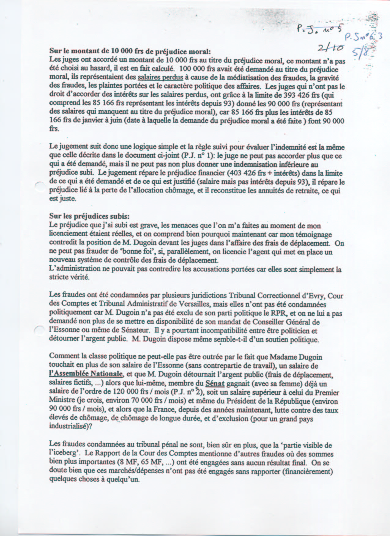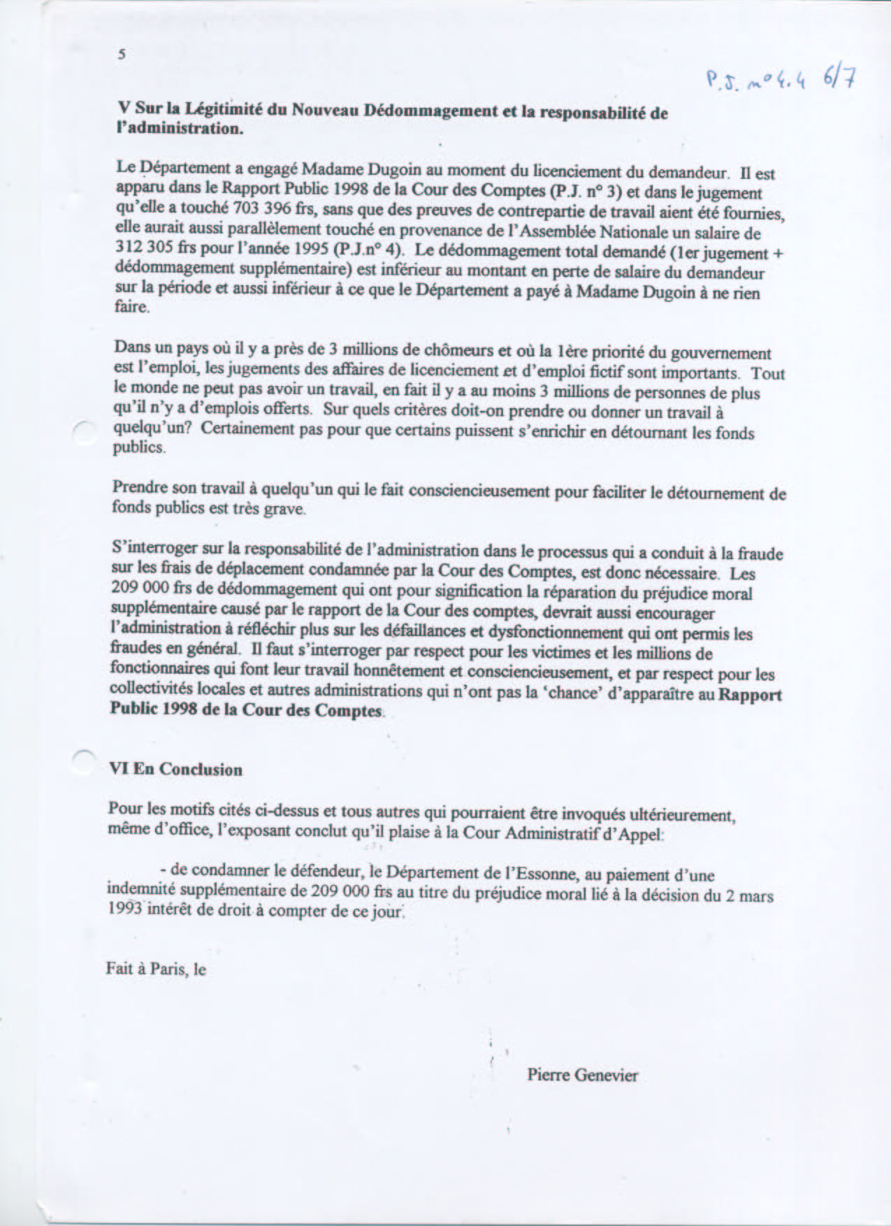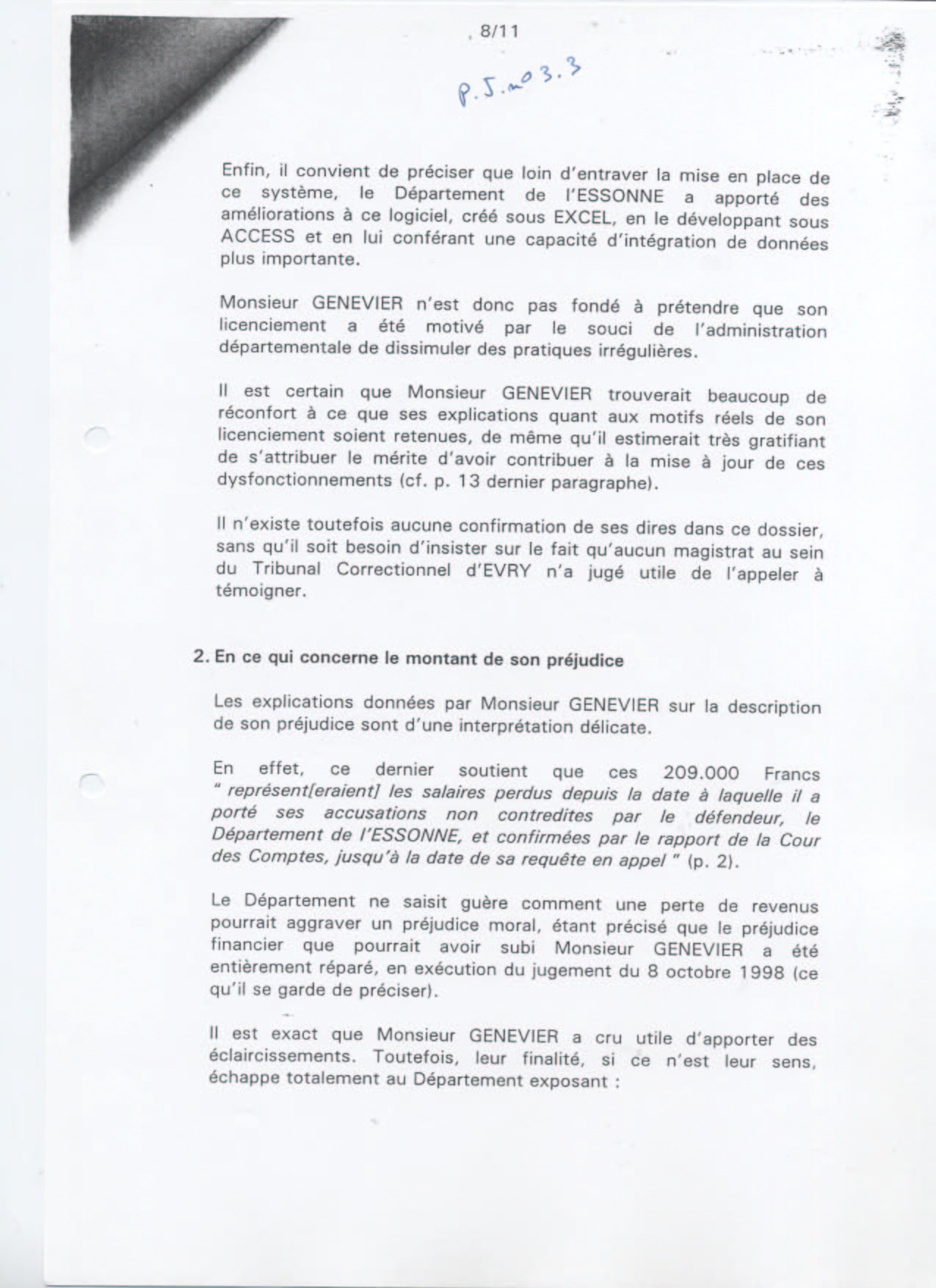 (see http://www.ccomptes.fr/FramePrinc/frame-rapports.htm, choose 'Publications:' 'liste des rapports', 'Rapports publics annuels 1998'). This new official publication on the frauds created me an even greater prejudice because I had absolutely nothing to do with these frauds, on the contrary, I was working to prevent one of them – the fraud on the travel expenses that allowed the administration President to unfairly increase his yearly salary by about FF220 000 ($40 000 about). The refusal to pay the judgment immediately also created me a greater prejudice because I was living in very difficult condition, was still having a lot of difficulties to find a job, and the amount of money I was granted would have helped me to justify that I had no responsibility in the frauds and that my dismissal was not for a professional wrongdoing (I could not hide on my resume that I worked at the Department of Essonne!). So I had to file an appeal to explain this new prejudice to the court and to ask for an additional compensation (about FF200 000, or $40 000), and did so in February 1999 [see