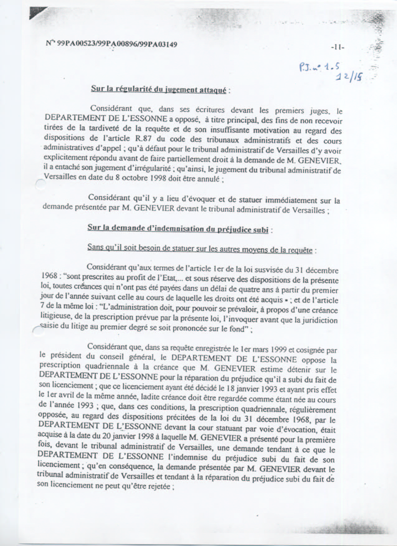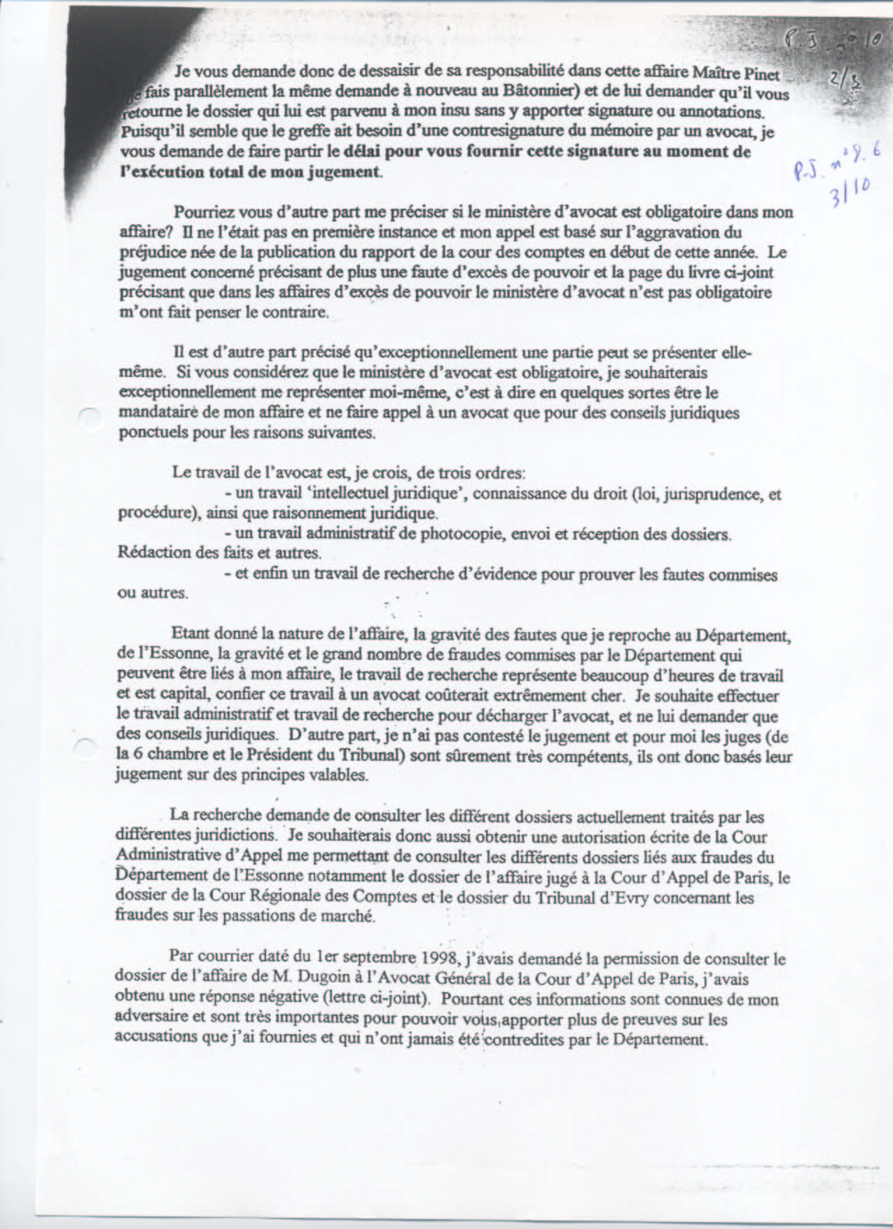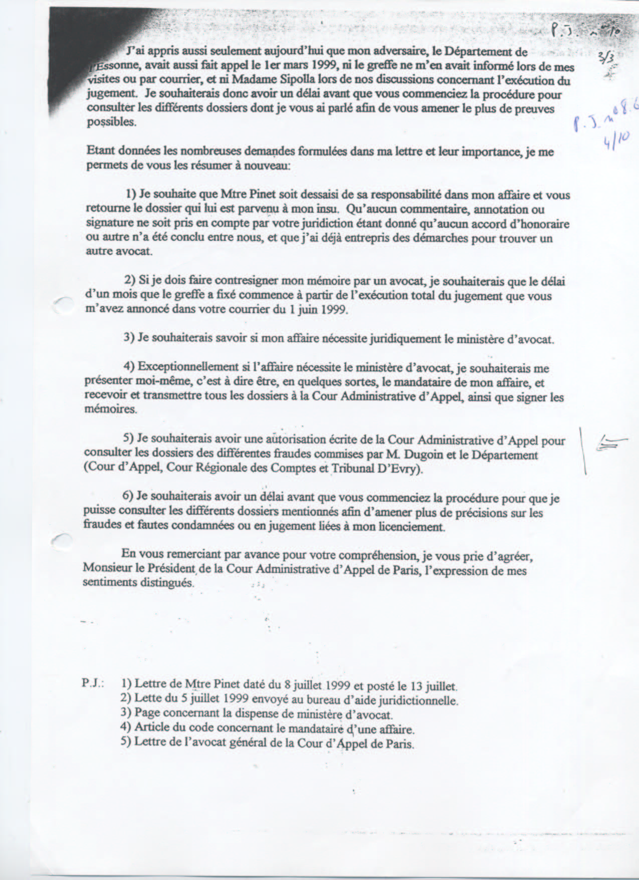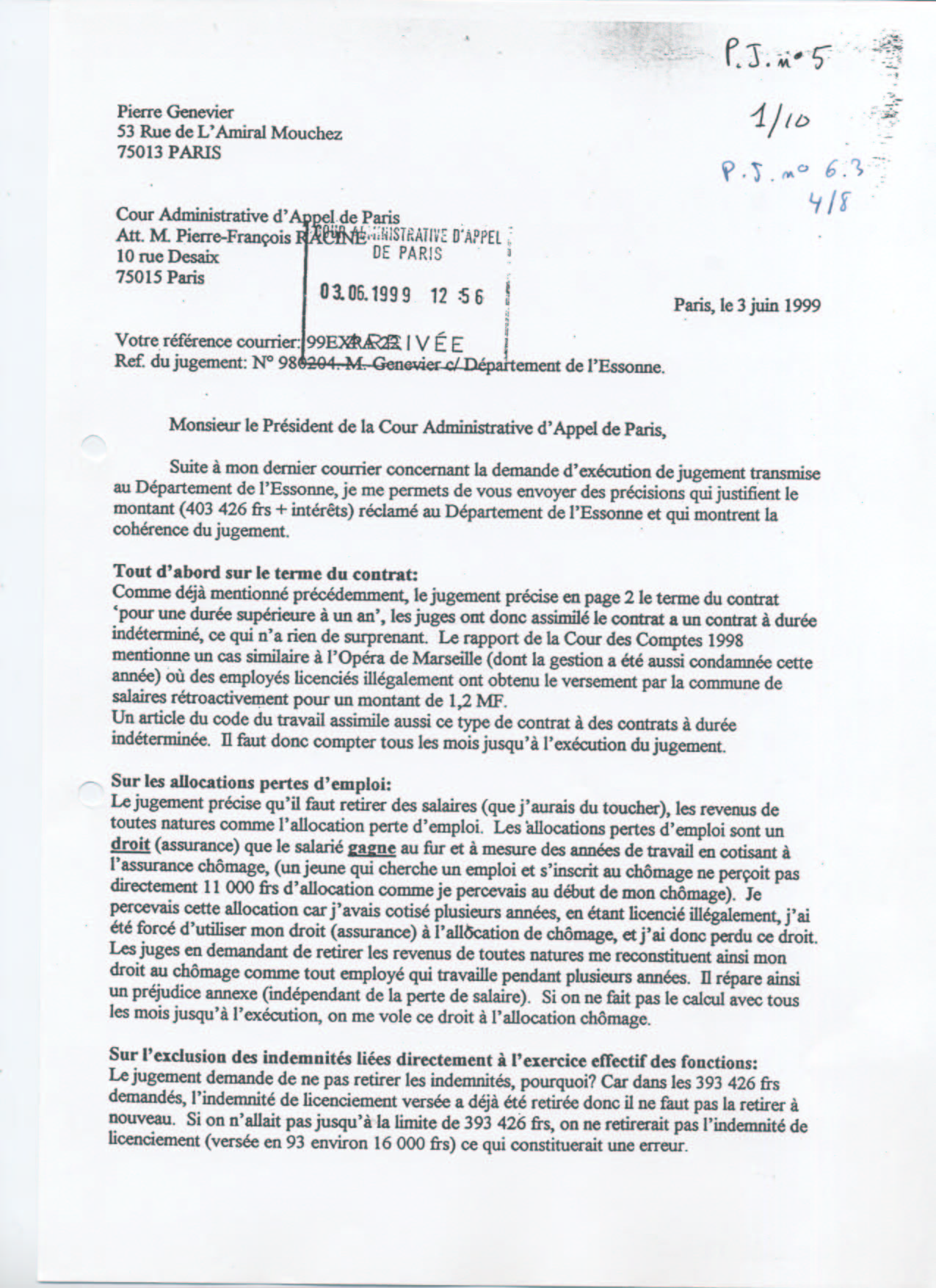 (see http://www.ccomptes.fr/FramePrinc/frame-rapports.htm, choose 'Publications:' 'liste des rapports', 'Rapports publics annuels 1998'). This new official publication on the frauds created me an even greater prejudice because I had absolutely nothing to do with these frauds, on the contrary, I was working to prevent one of them – the fraud on the travel expenses that allowed the administration President to unfairly increase his yearly salary by about FF220 000 ($40 000 about). The refusal to pay the judgment immediately also created me a greater prejudice because I was living in very difficult condition, was still having a lot of difficulties to find a job, and the amount of money I was granted would have helped me to justify that I had no responsibility in the frauds and that my dismissal was not for a professional wrongdoing (I could not hide on my resume that I worked at the Department of Essonne!). So I had to file an appeal to explain this new prejudice to the court and to ask for an additional compensation (about FF200 000, or $40 000), and did so in February 1999 [see