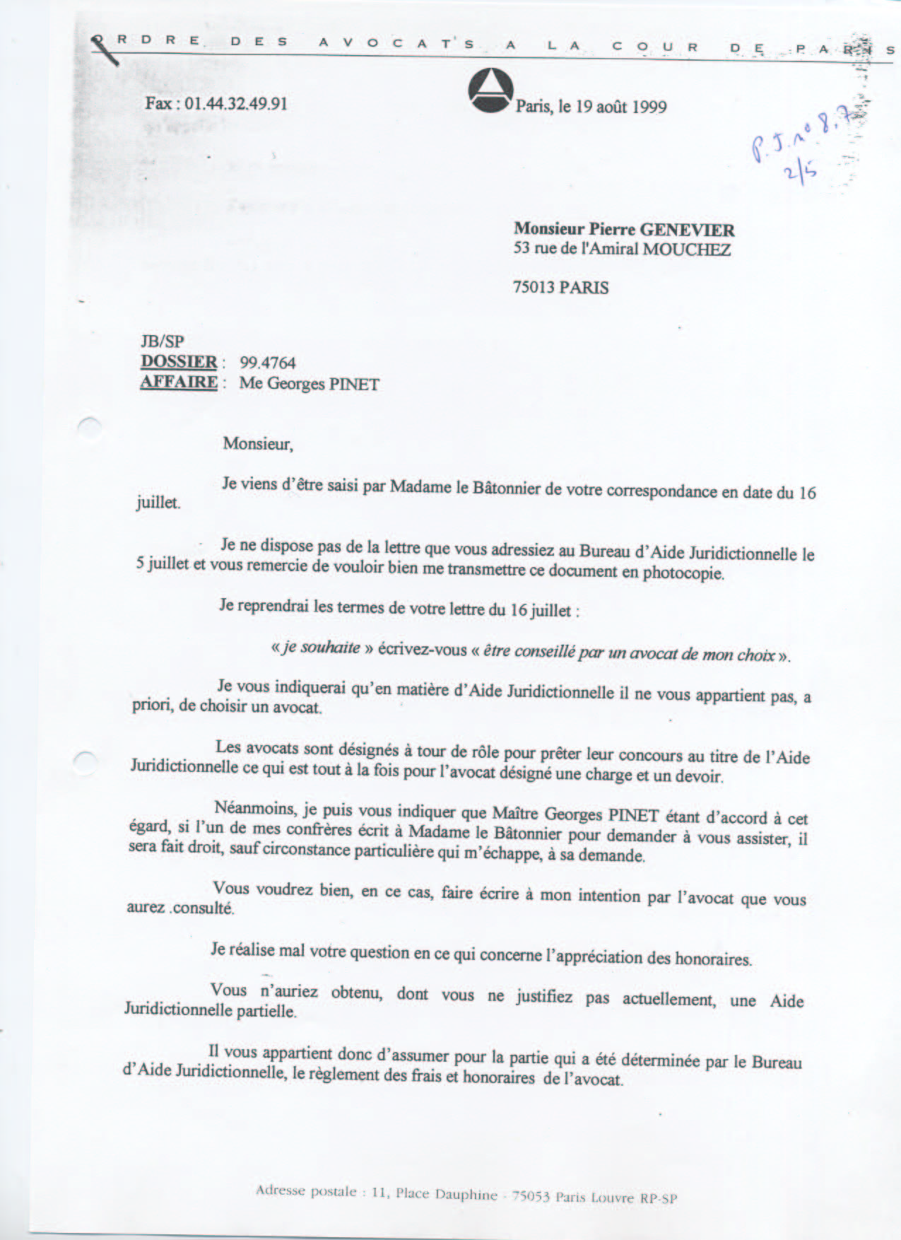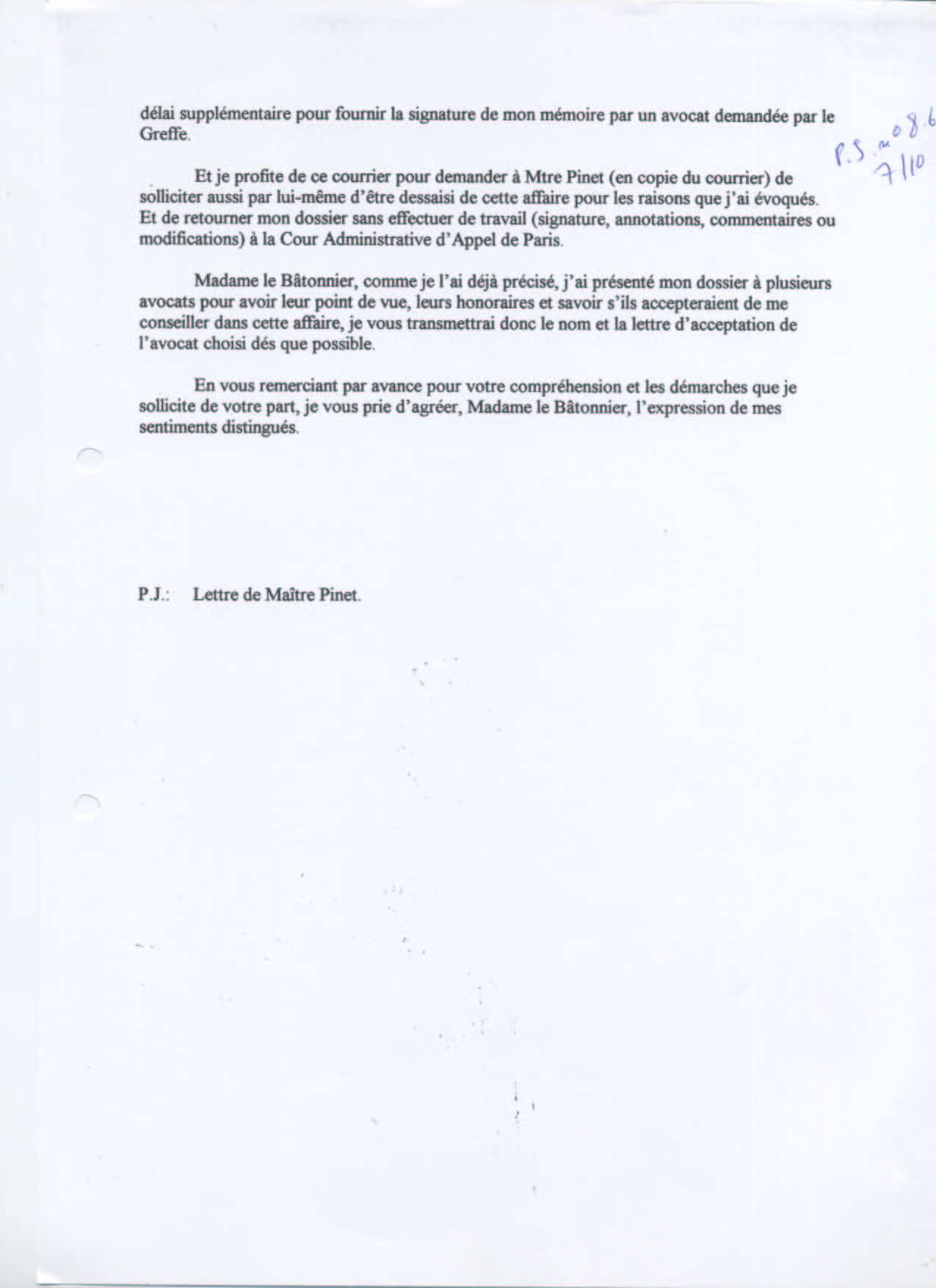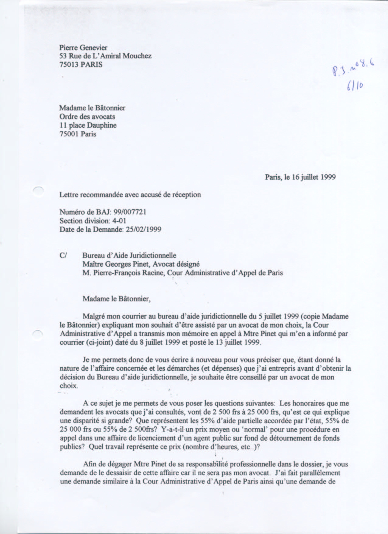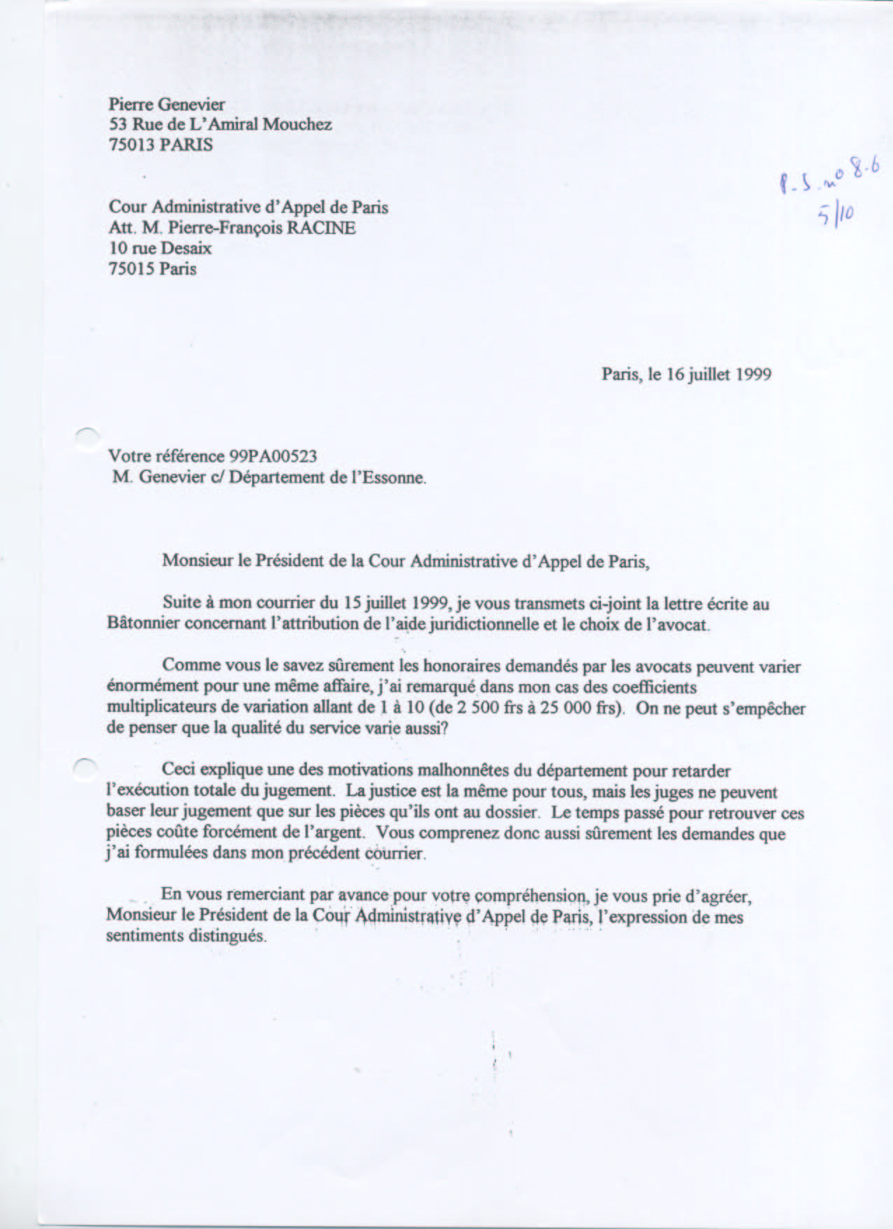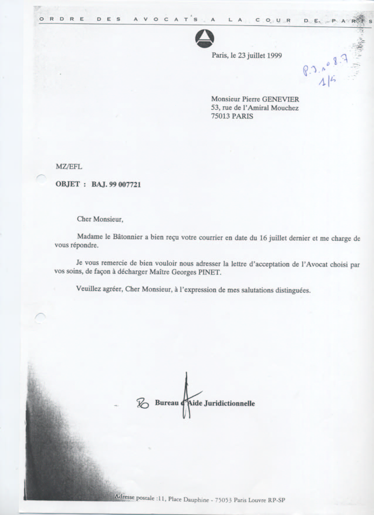 (38.), and was referred to a lawyer. I met him, explained him the case, described the various political persecutions I was victim of at the same time (surveillance, harassment, errors from the administration on my benefits…), asked him what was the meaning of the 55% aid (how many hours were paid for, what kind of service were paid for, etc.), and asked him if he could help me with his expertise on the legal issues of the case mainly [lawyer are paid very little through the jurisdictional help, so I did not want him to spent time inappropriately on making photocopies and writing papers without paying attention to the legal issues or on legal research]. I offered him to make the photocopies, to write part of the pleadings and to deliver the papers to the courts myself to optimize the aid I was given (and also to limit the possibility of wrongdoings by the lawyer and to avoid having to fight with my own lawyer).