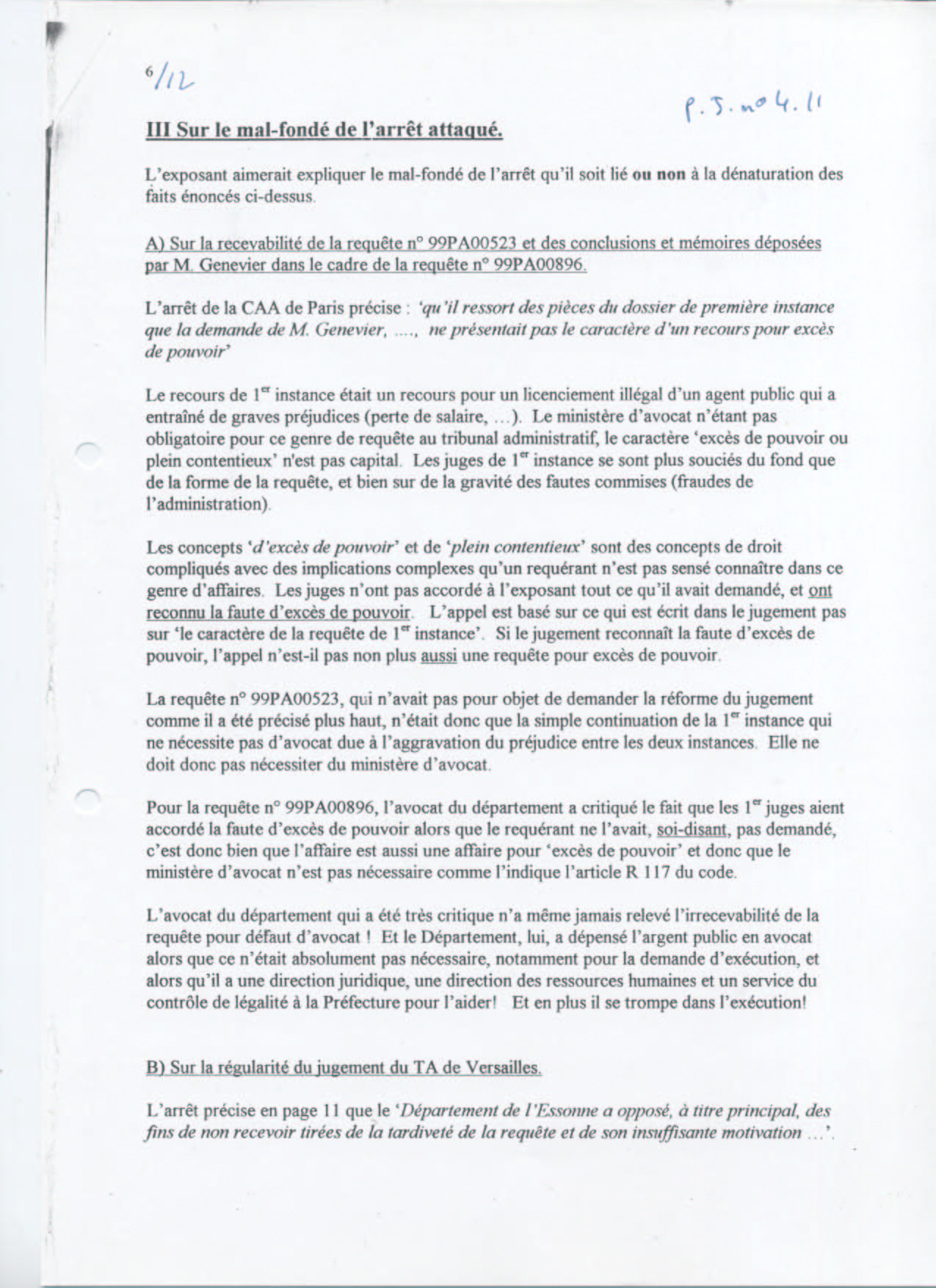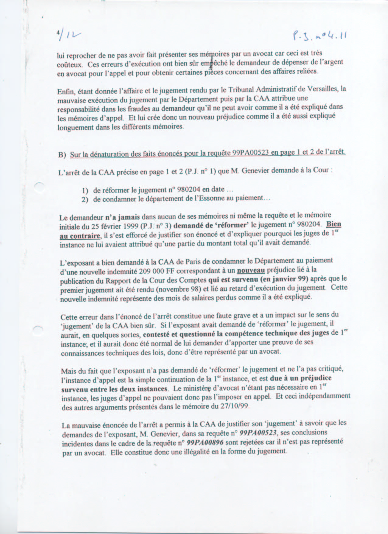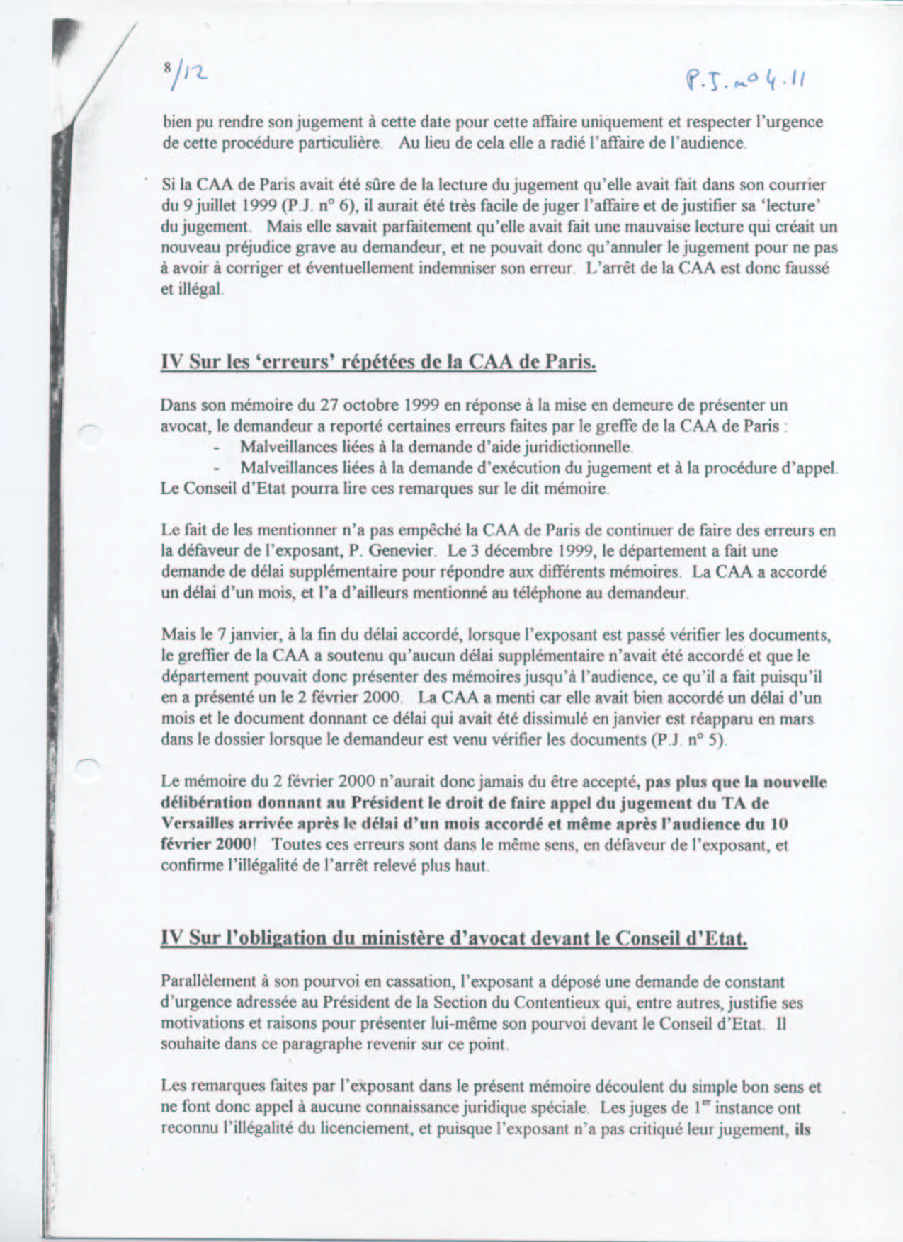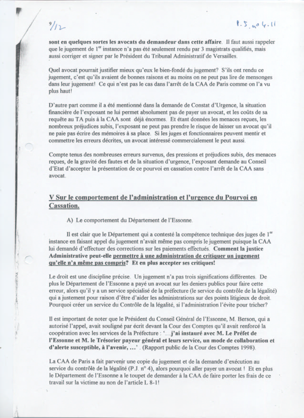 ignored also the argument concerning the type of appeal I was taking. I had explained to the Appeal Court that I was not appealing to criticize the first judgment (the judgment was fair, it was the way they interpreted it that was unfair), and that I was only appealing the judgment to ask for an additional compensation due to the recent ‘Cours des Comptes’ report, so that my appeal was simply the continuation of the first proceeding and therefore they were no need or no legal requirement to be represented by a lawyer [see letter to the court
