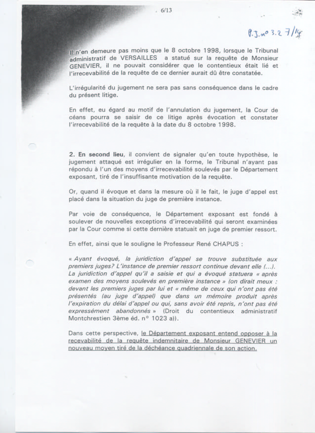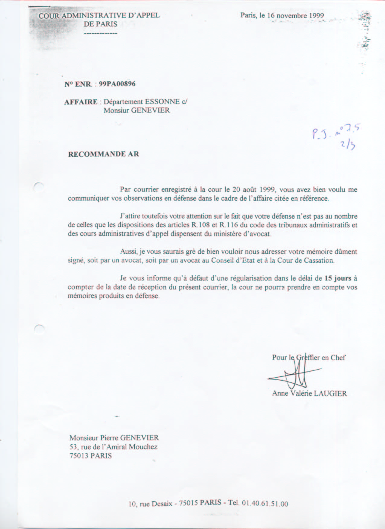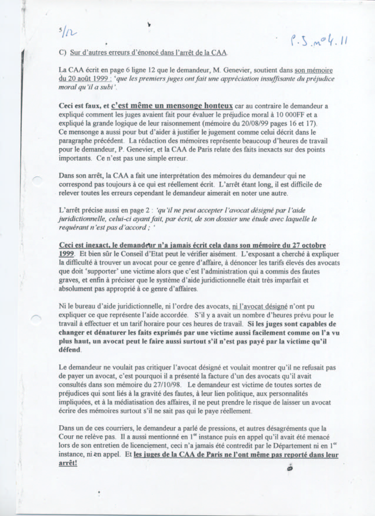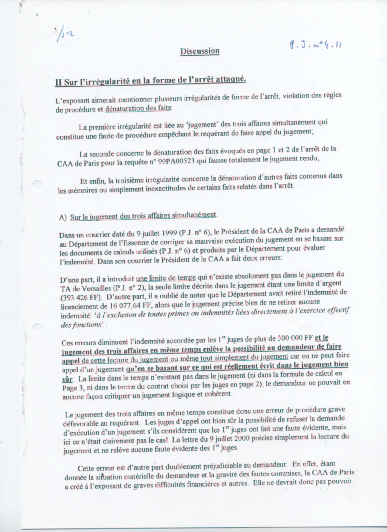ignored also the argument concerning the type of appeal I was taking. I had explained to the Appeal Court that I was not appealing to criticize the first judgment (the judgment was fair, it was the way they interpreted it that was unfair), and that I was only appealing the judgment to ask for an additional compensation due to the recent ‘Cours des Comptes’ report, so that my appeal was simply the continuation of the first proceeding and therefore they were no need or no legal requirement to be represented by a lawyer [see letter to the court