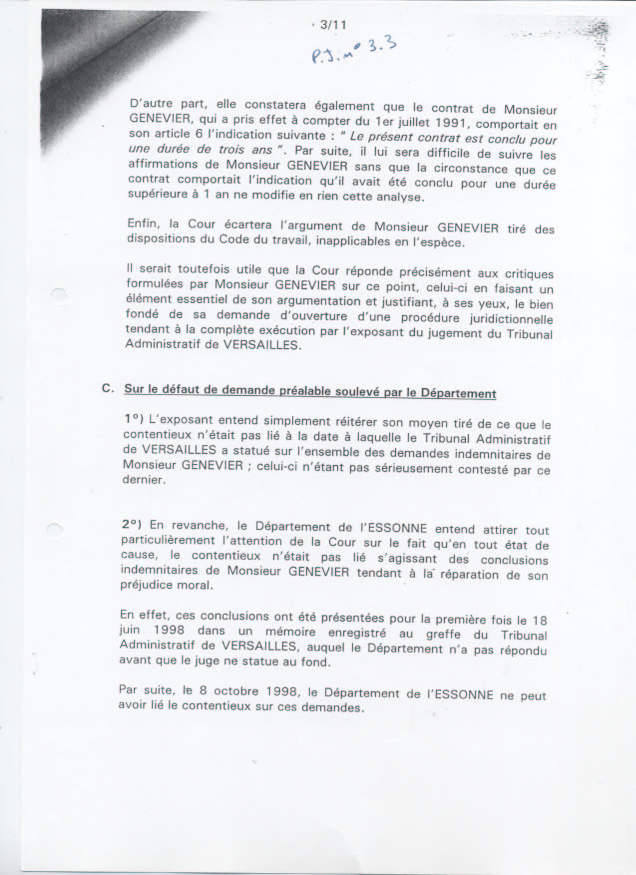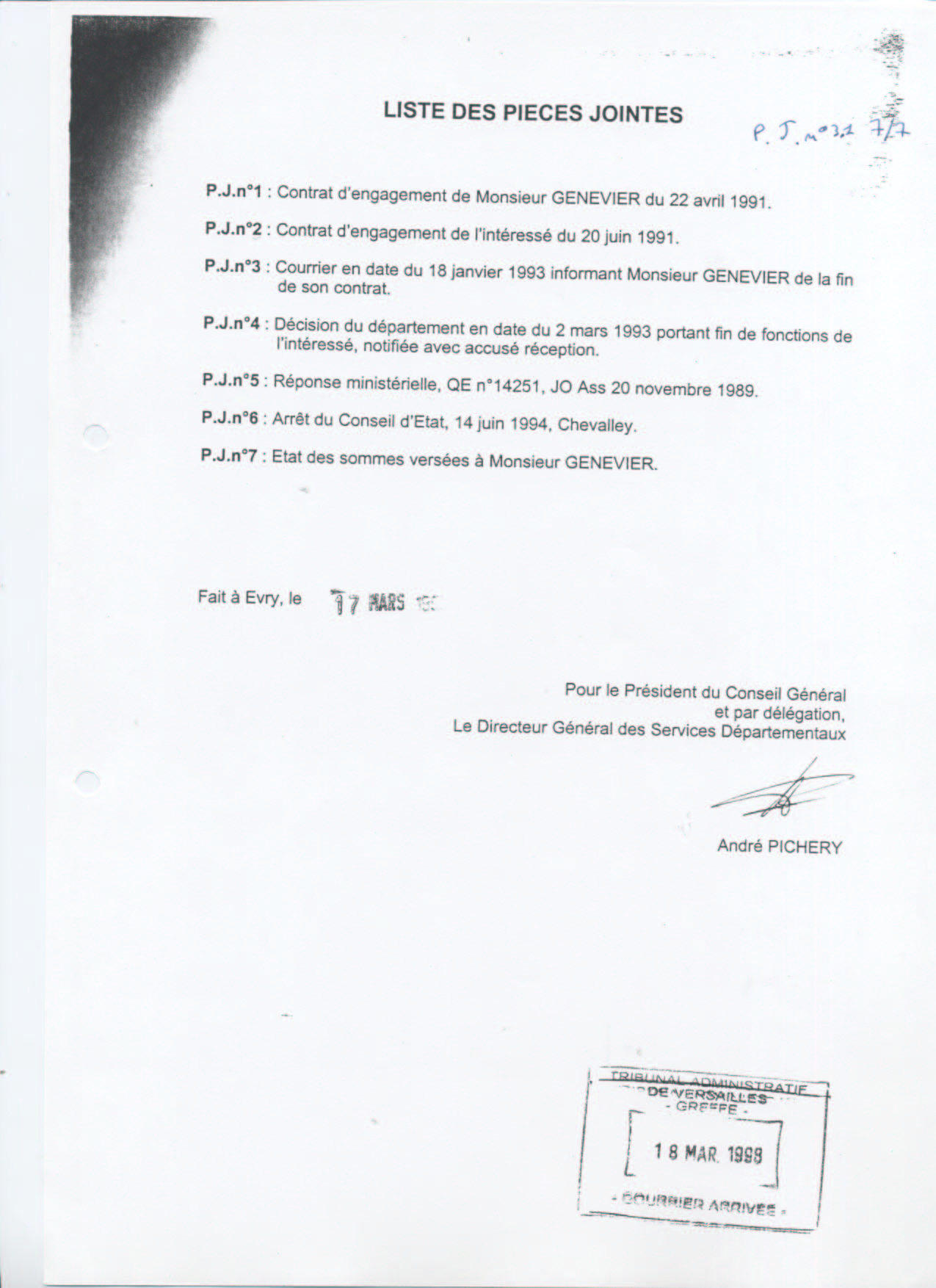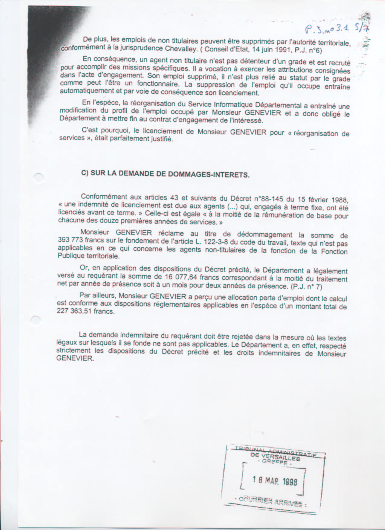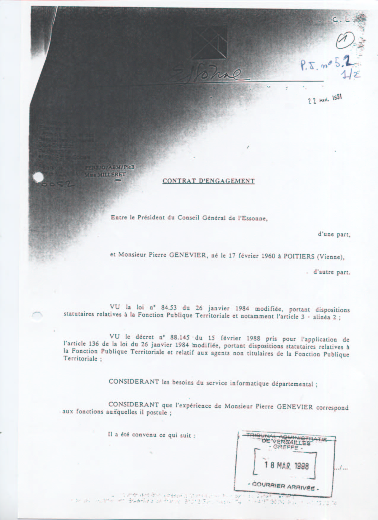 ‘code du travail L122.1’] (in fact all my colleagues, many of which had the same contract as I, were still working at the Department in 98 when I sued). The Department knew this, of course, and the justice also, especially after I had reminded them of art L122-1-2 (I did not know it before the Tribunal Administrative of Versailles rendered its judgment on 10-8-98). These contracts were issued mostly for technical jobs for which the administration could not hire civil servants through standard examination system, but it would have been unfair not to give these technical staffs the same job protection than their colleagues (hired for an indefinite period of time) when they were hired to render a service that was not available through the normal hiring process, so they issued contracts with a term, and added a joint possibility to end the contract that made them unlimited term contract! [I also heard that these contracts were illegal and that the government – ‘Prefecture’ – regularly sued the Department for these types of contracts!] In its judgment the court asked the Department to pay me my salaries (