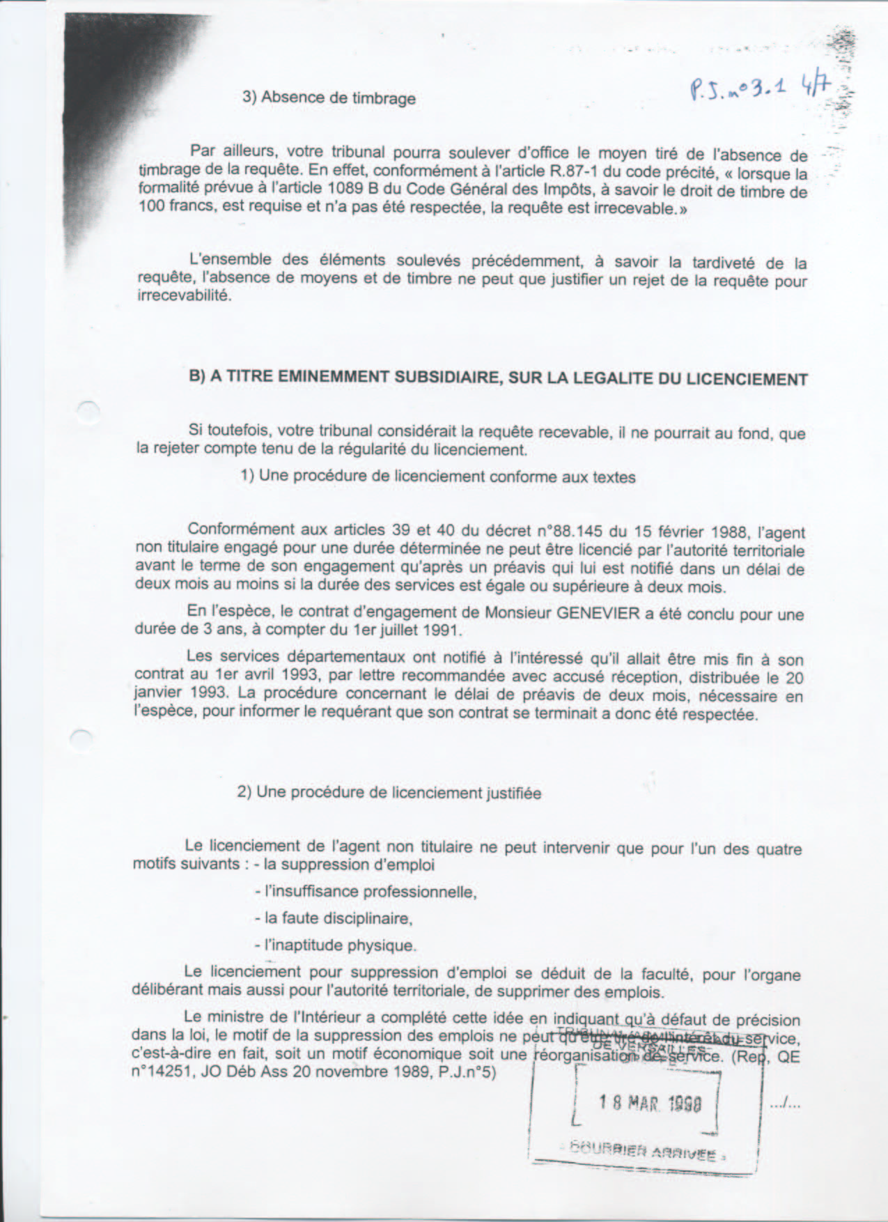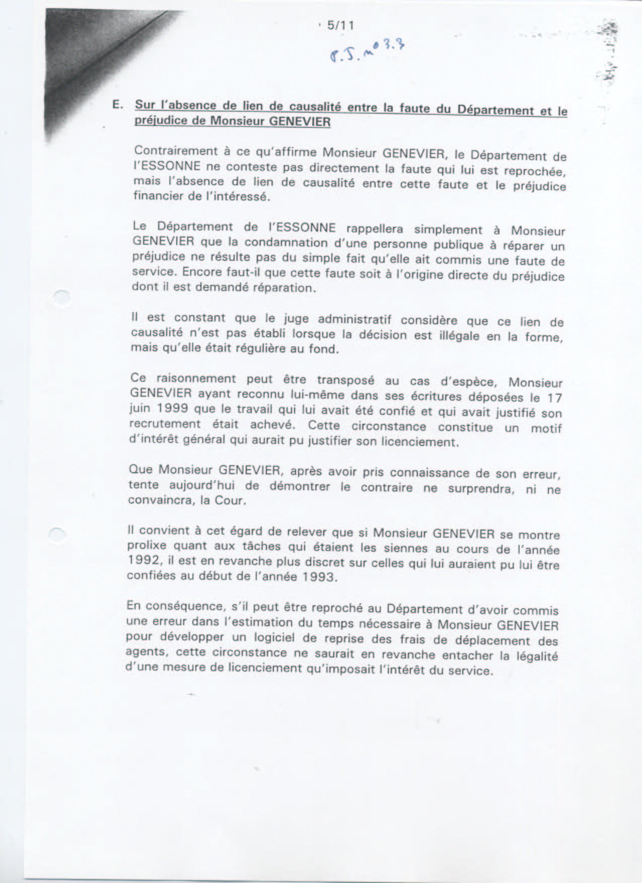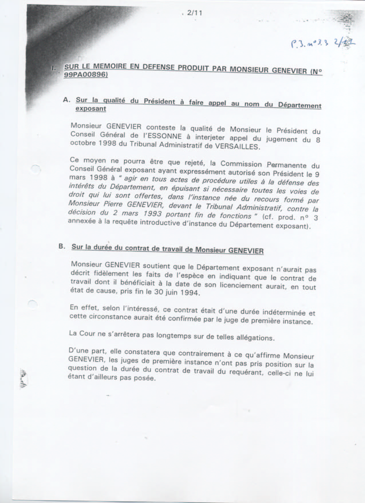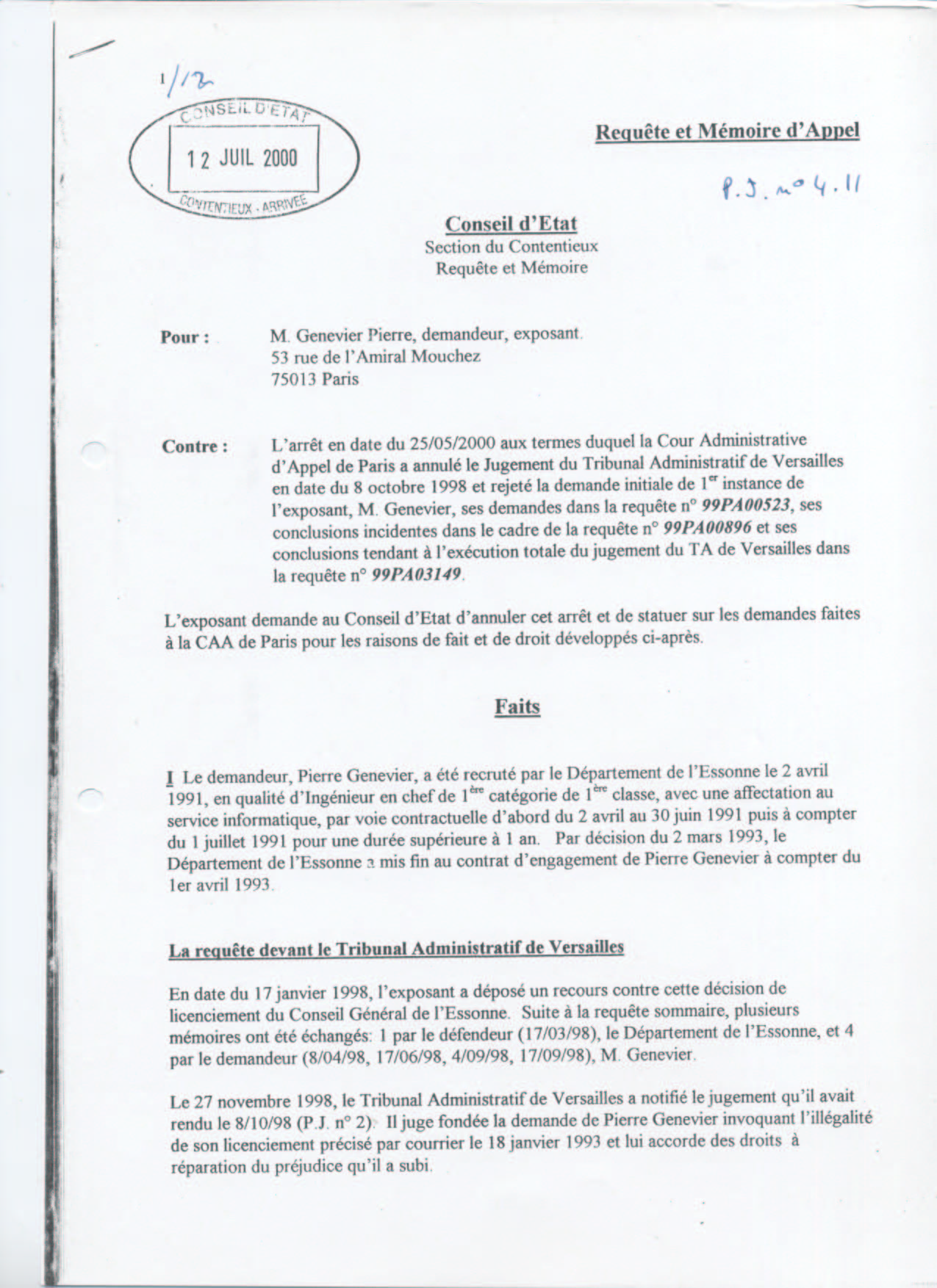 ‘code du travail L122.1’] (in fact all my colleagues, many of which had the same contract as I, were still working at the Department in 98 when I sued). The Department knew this, of course, and the justice also, especially after I had reminded them of art L122-1-2 (I did not know it before the Tribunal Administrative of Versailles rendered its judgment on 10-8-98). These contracts were issued mostly for technical jobs for which the administration could not hire civil servants through standard examination system, but it would have been unfair not to give these technical staffs the same job protection than their colleagues (hired for an indefinite period of time) when they were hired to render a service that was not available through the normal hiring process, so they issued contracts with a term, and added a joint possibility to end the contract that made them unlimited term contract! [I also heard that these contracts were illegal and that the government – ‘Prefecture’ – regularly sued the Department for these types of contracts!] In its judgment the court asked the Department to pay me my salaries (