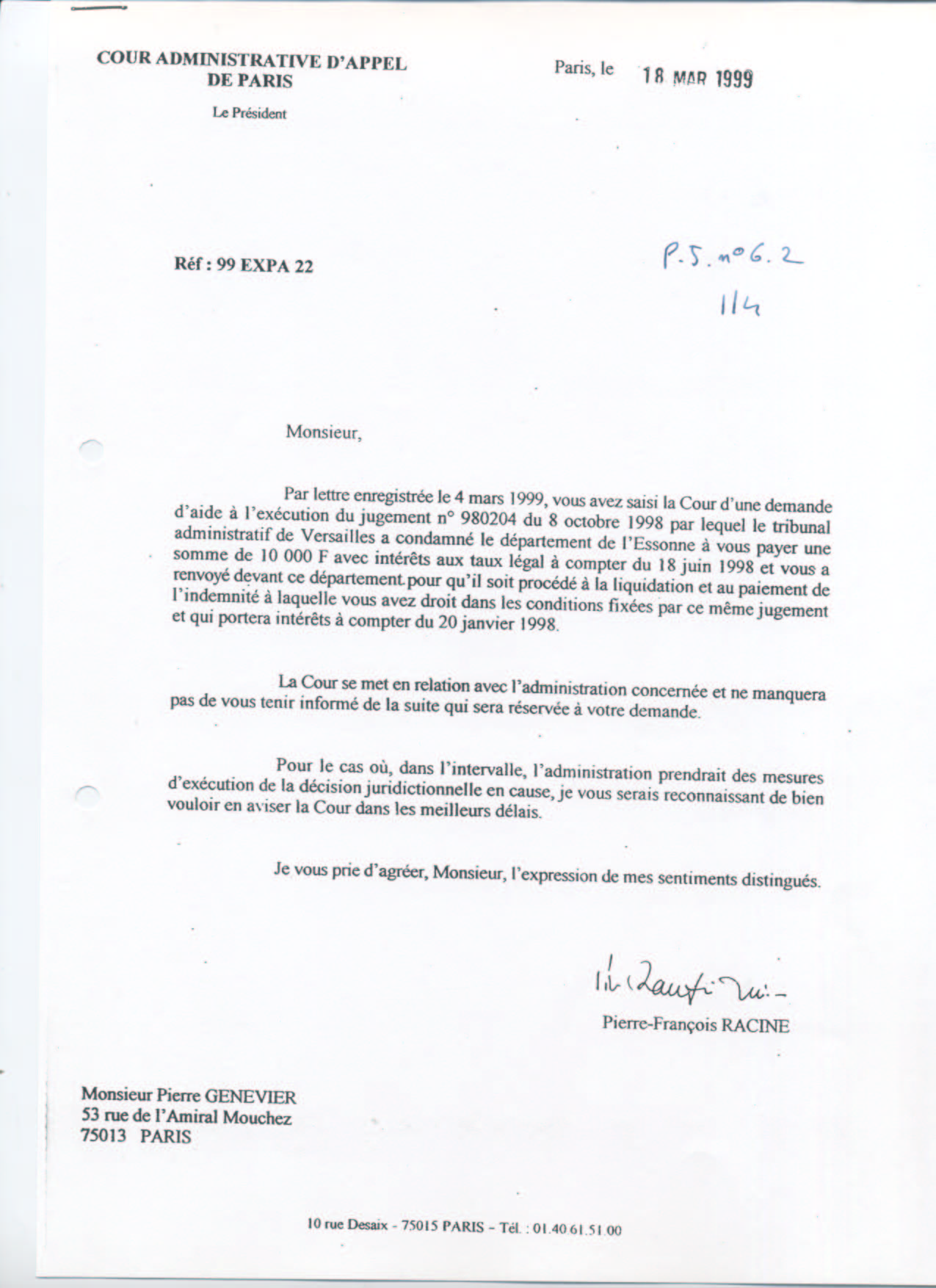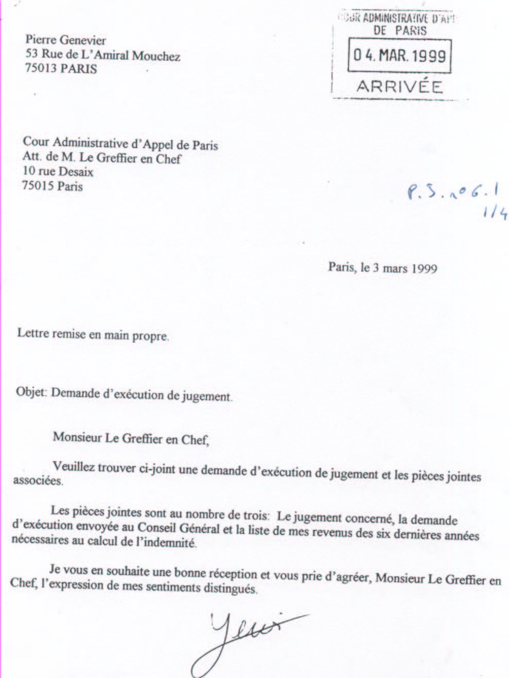 I complained to the Appeal Court Presiding Judge who usually handles this kind of matter, and he wrote to the Department and the Prefecture to make sure the judgment would be executed properly [see
